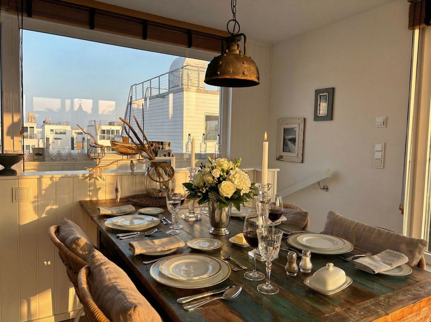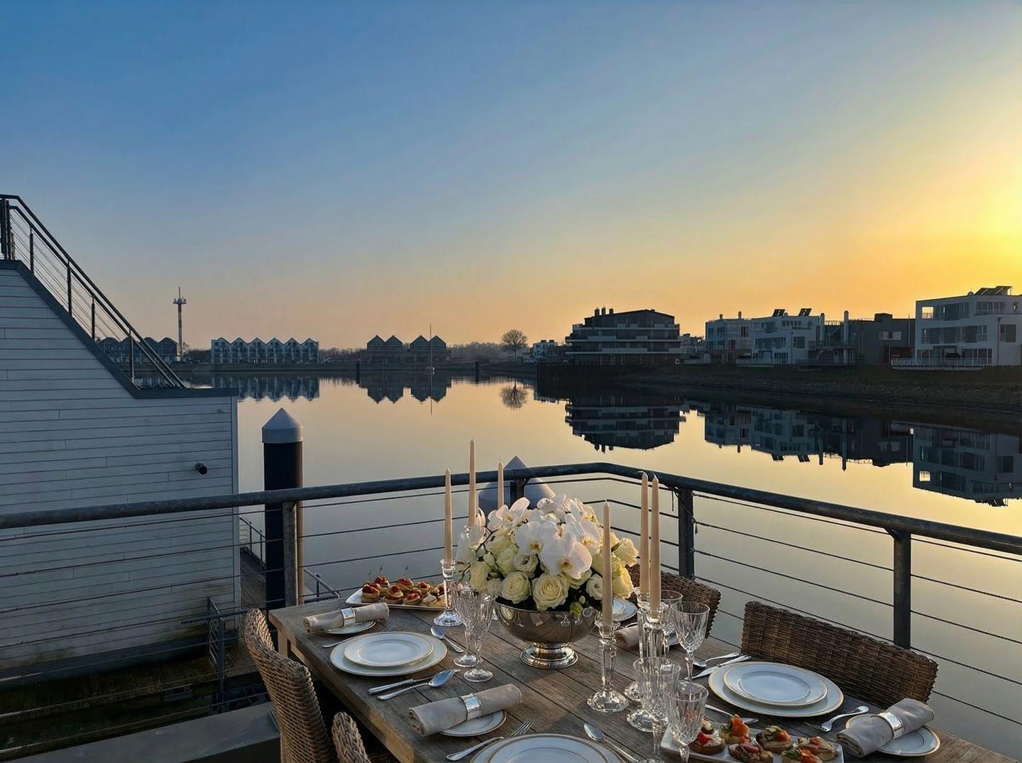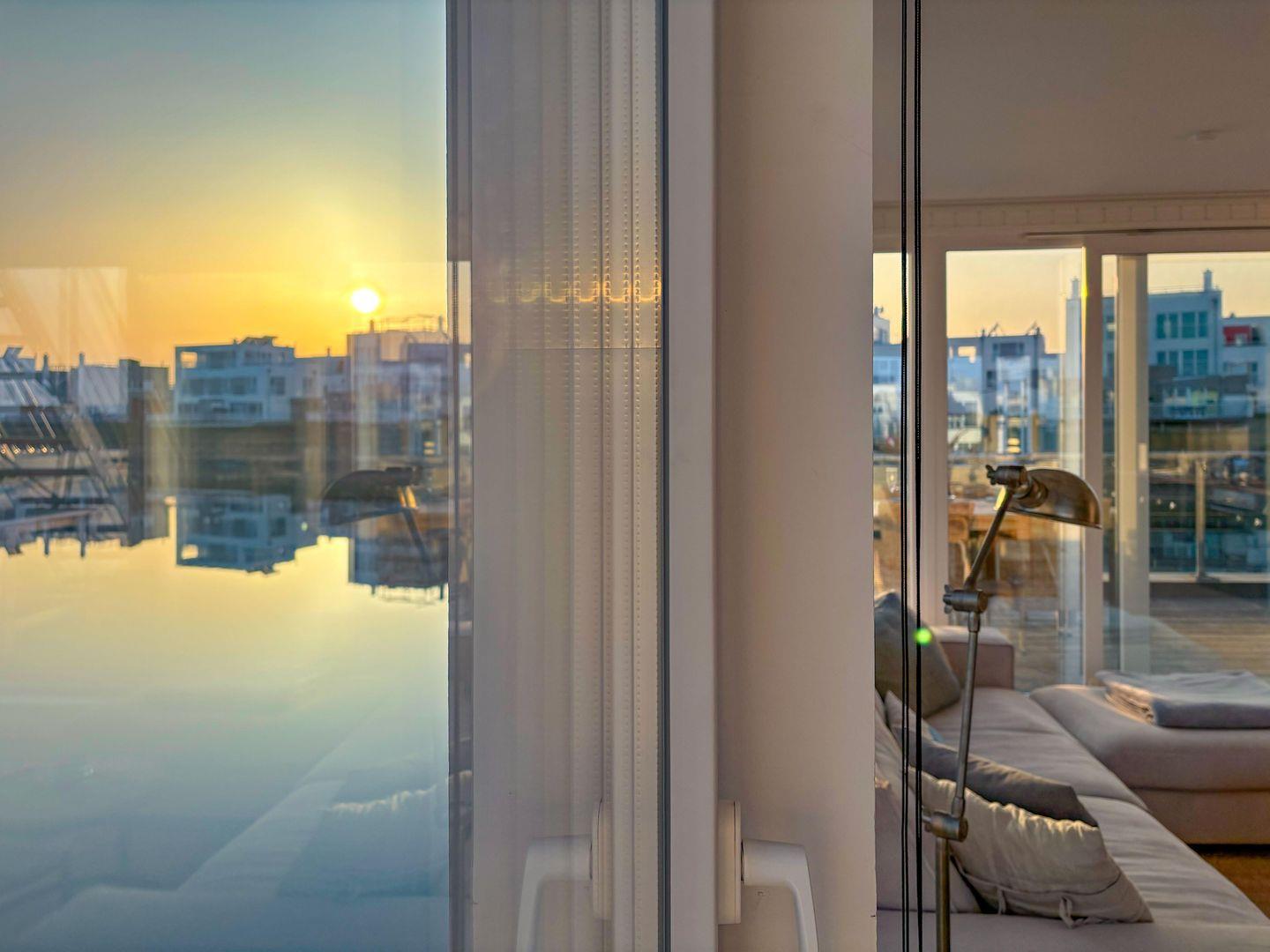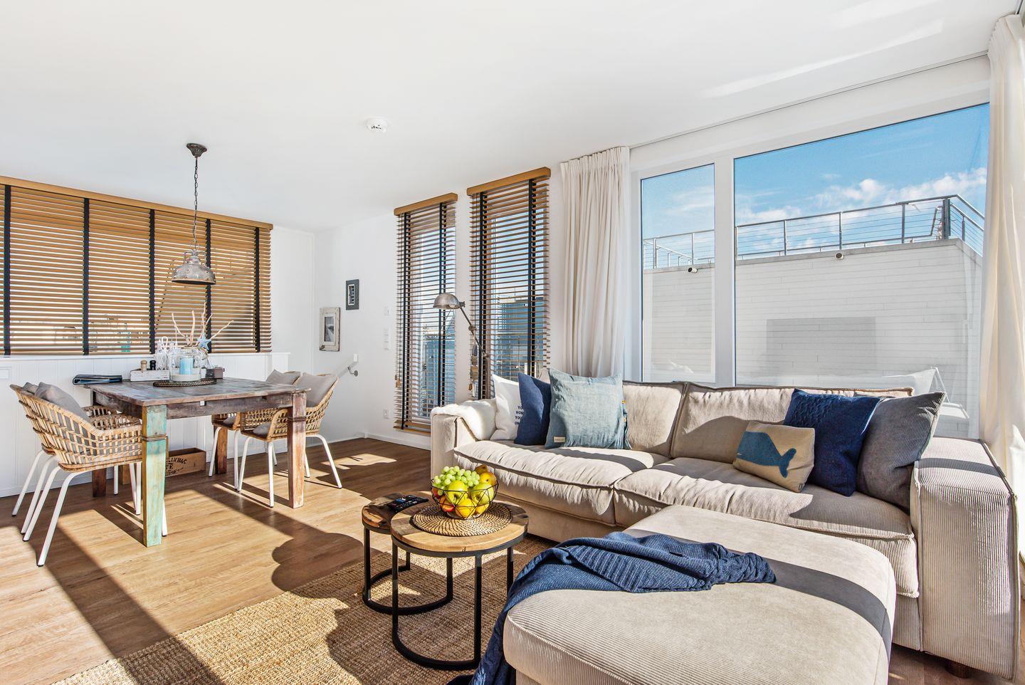 Das schwimmende Ferienhaus "Treibholz" verfügt über 2 Etagen, wobei sich der große Wohn-/Essbereich mit integrierter Küche im Obergeschoss befindet. Die großen Panoramafenster ermöglichen einen wunderbaren Blick auf das Hafenkino und über eine große Schiebetür gelangt man auf die große Terrasse. Das Obergeschoss mit seinem gemütlichen Schlafsofa, dem Esstisch und der gut ausgestatteten Küche lädt zu gemütliche Stunden mit Freunden und der Familie ein.