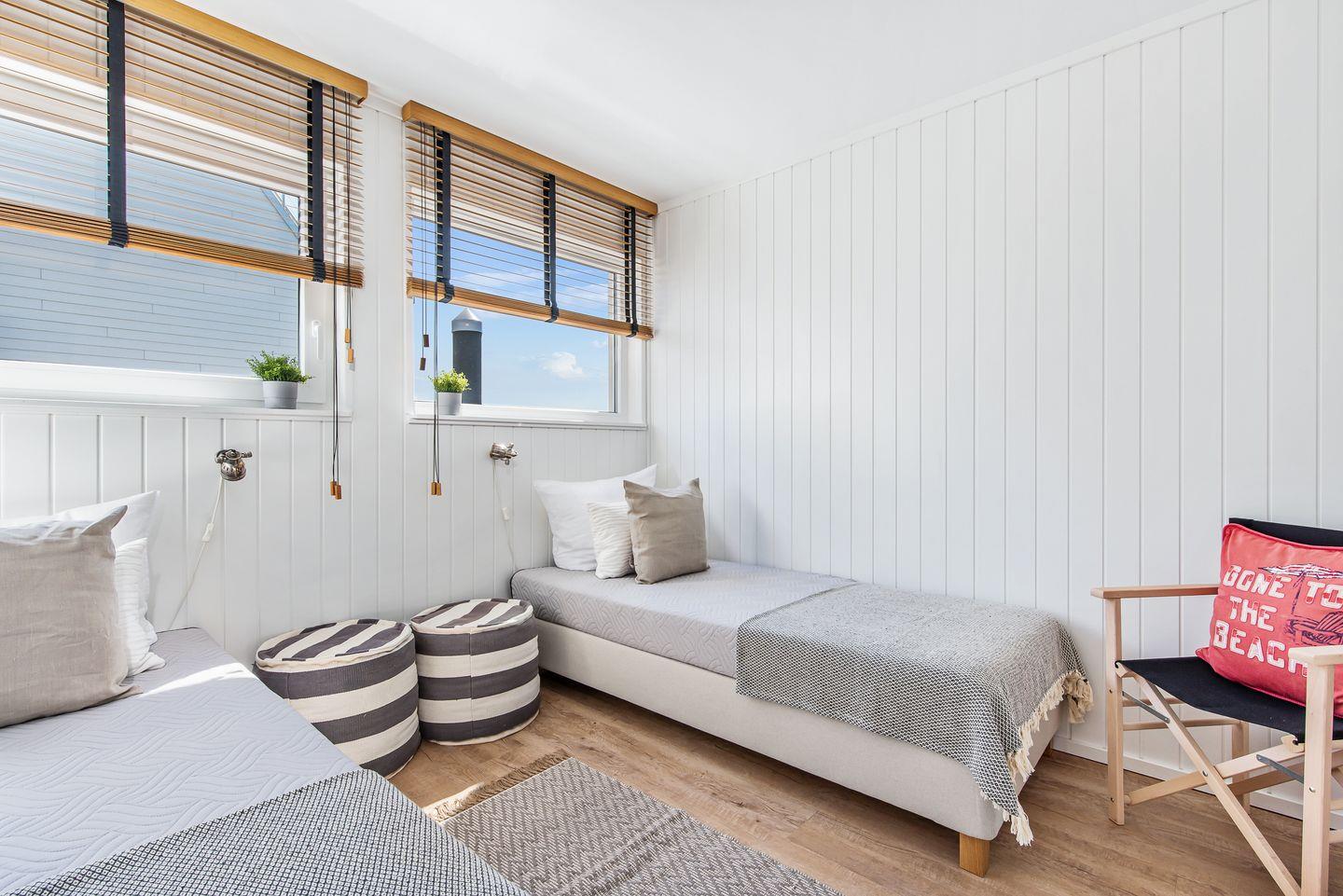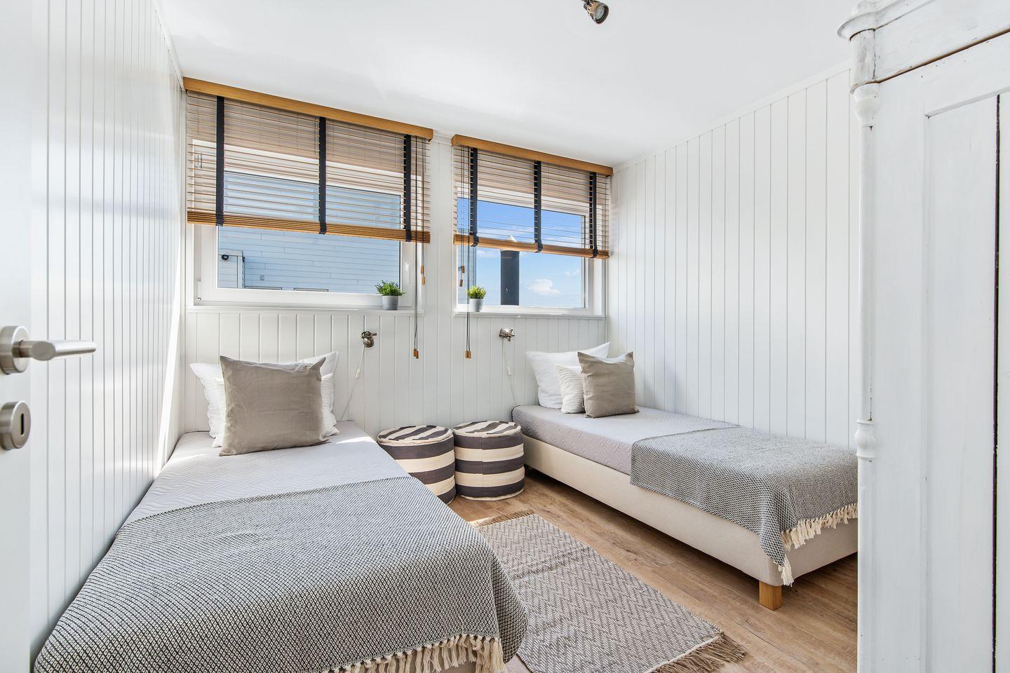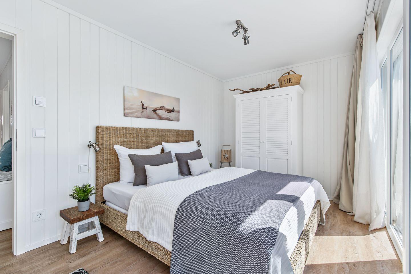 Im Erdgeschoss befinden sich zwei Schlafzimmer. Das große Schlafzimmer verfügt über ein Doppelbett (160x200), bodentiefe Panoramafenster und ist mit einer großen Schiebetür ausgestattet. Von hier aus ist der direkte Zugang zur unteren, um das komplette Haus verlaufenden Terrasse, möglich. Das zweite Schlafzimmer bietet 2 gemütliche Einzelbetten.
