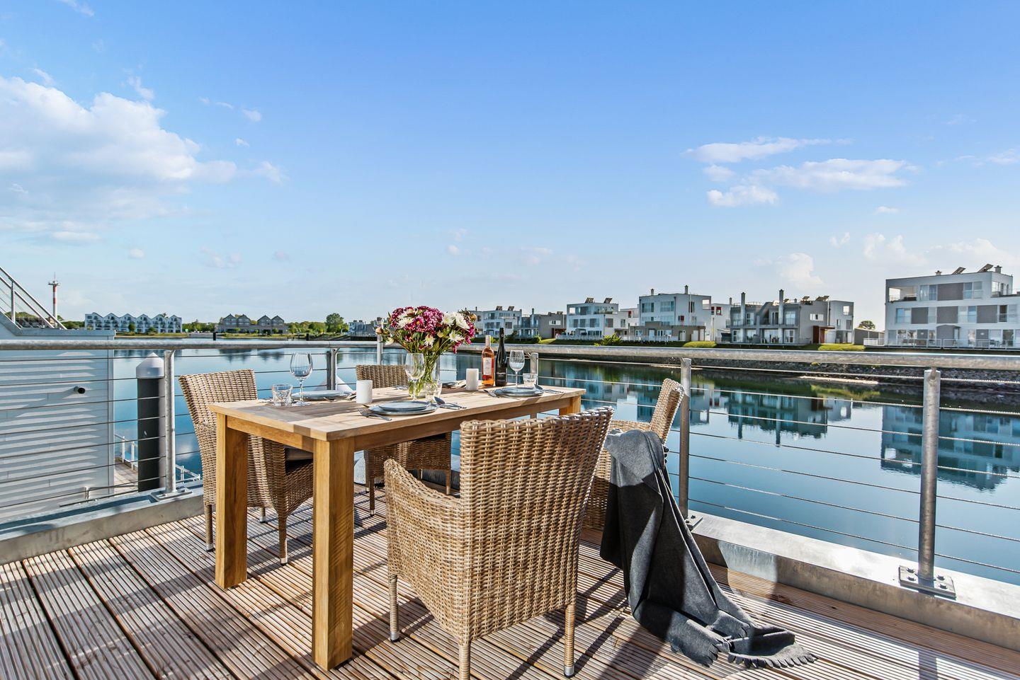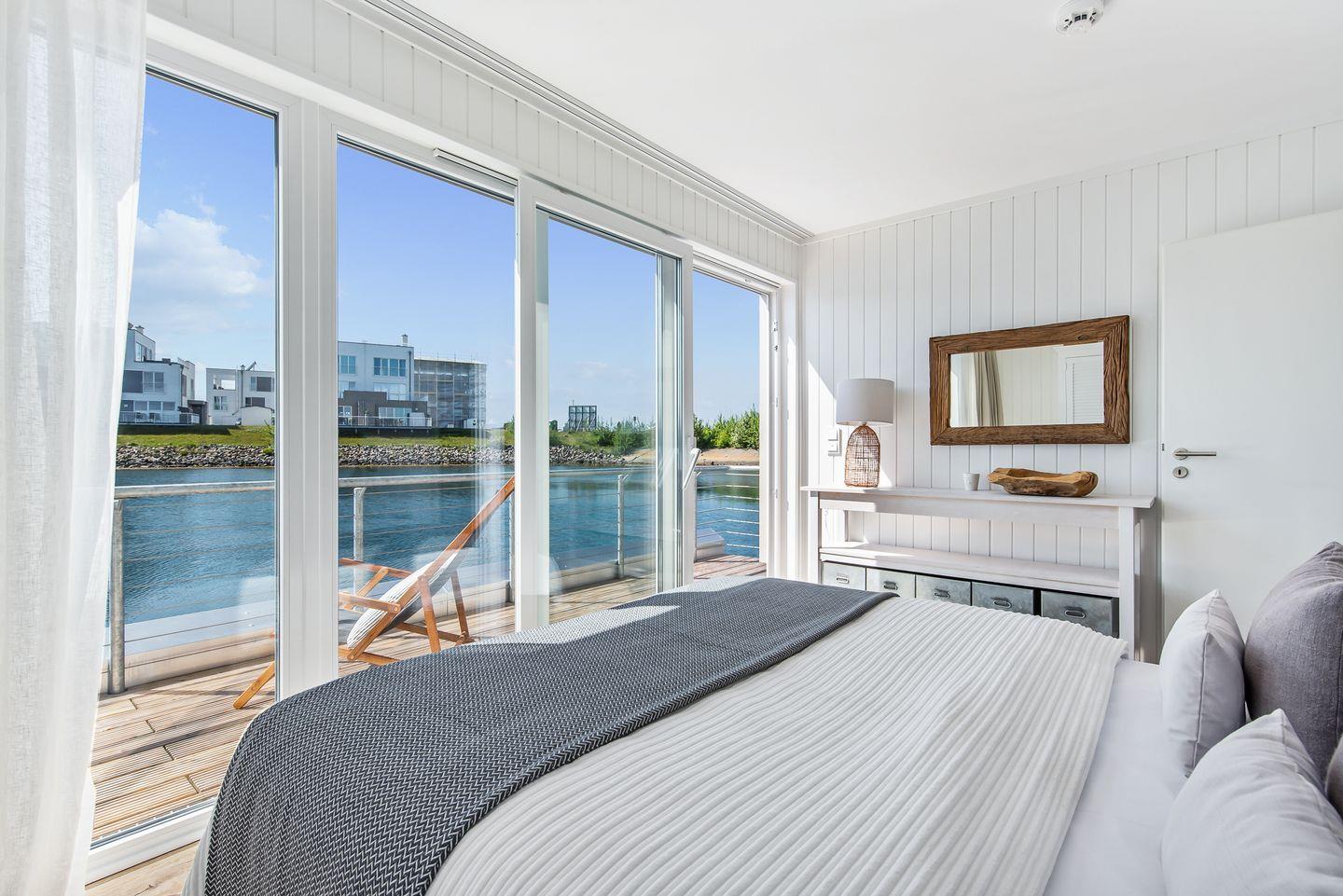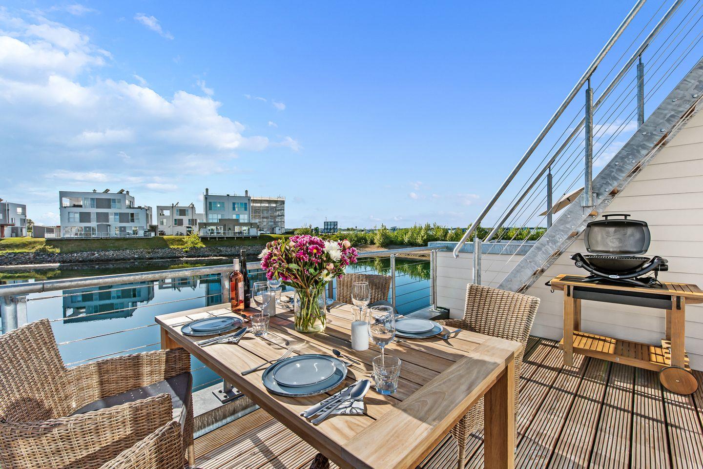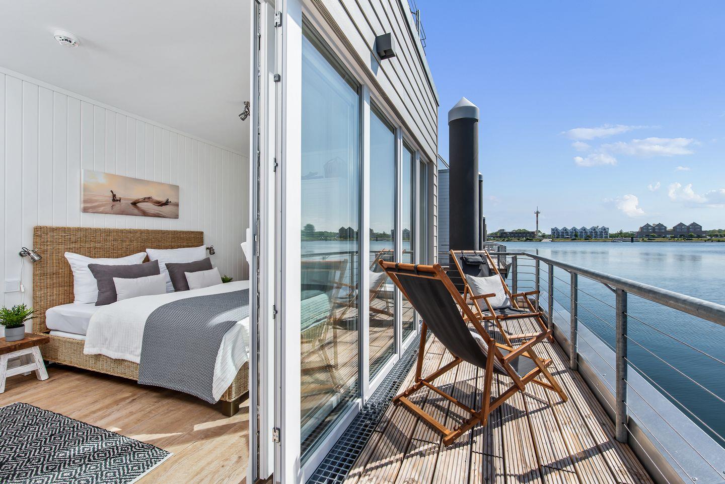 Erleben Sie das schwimmende Wasserhaus "Treibholz" mit Dachterrasse, Sauna und Ostseeblick im Ostseeresort Olpenitz.