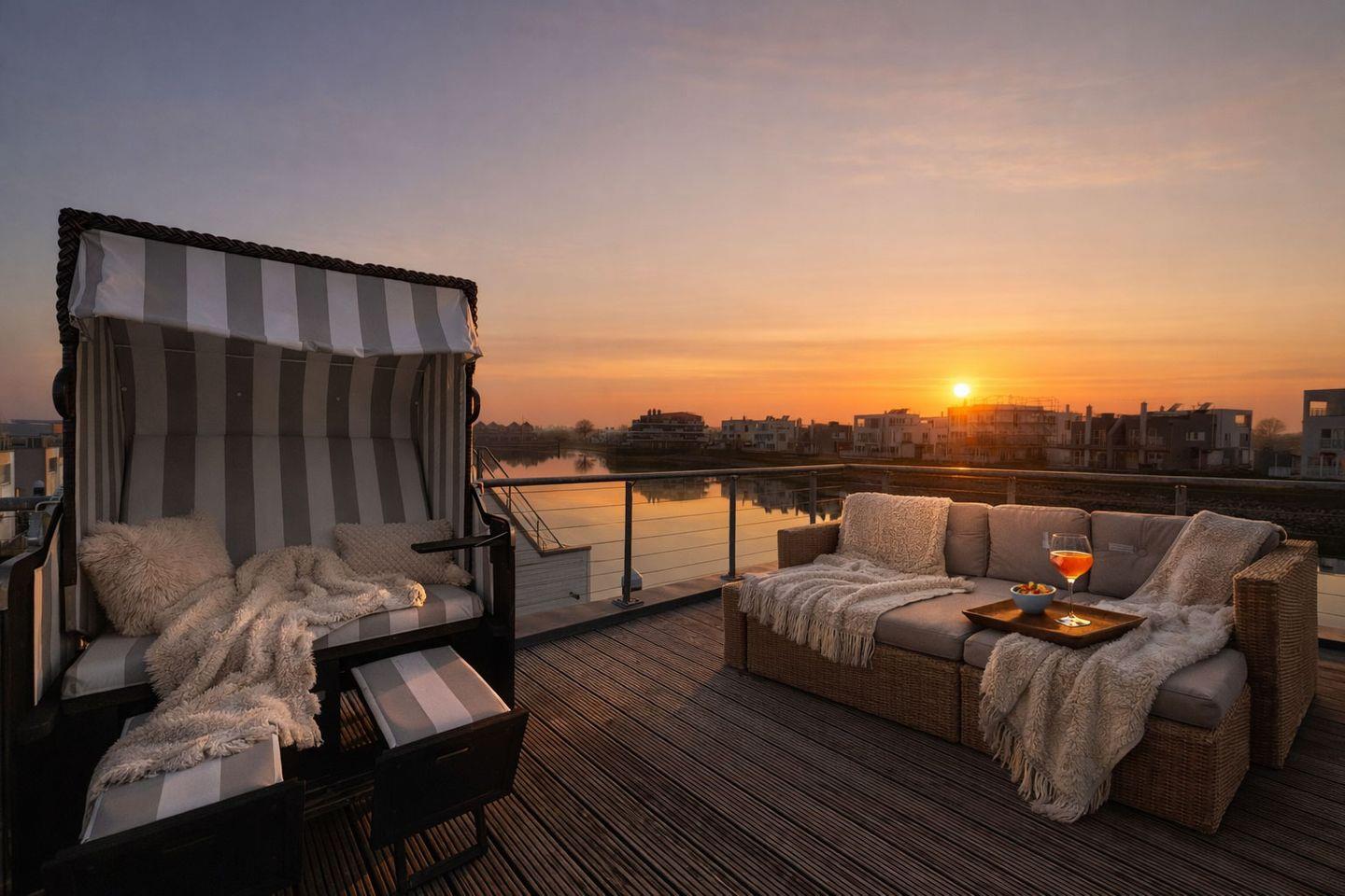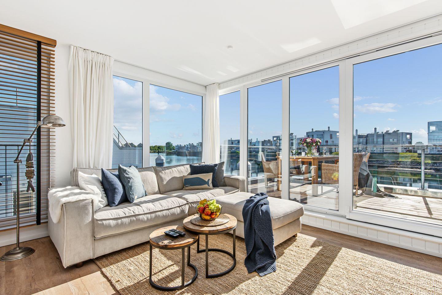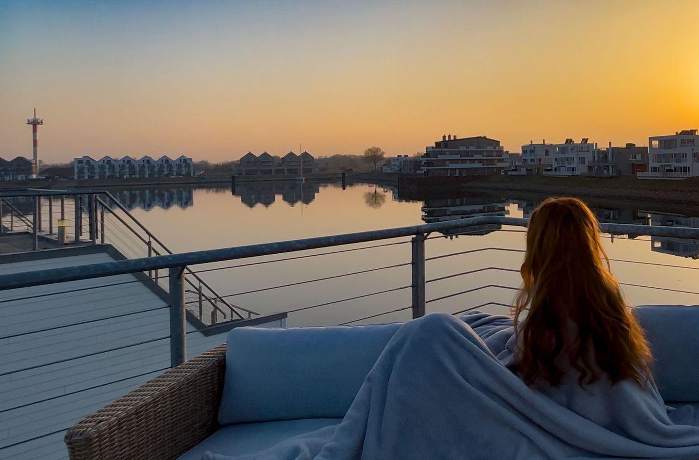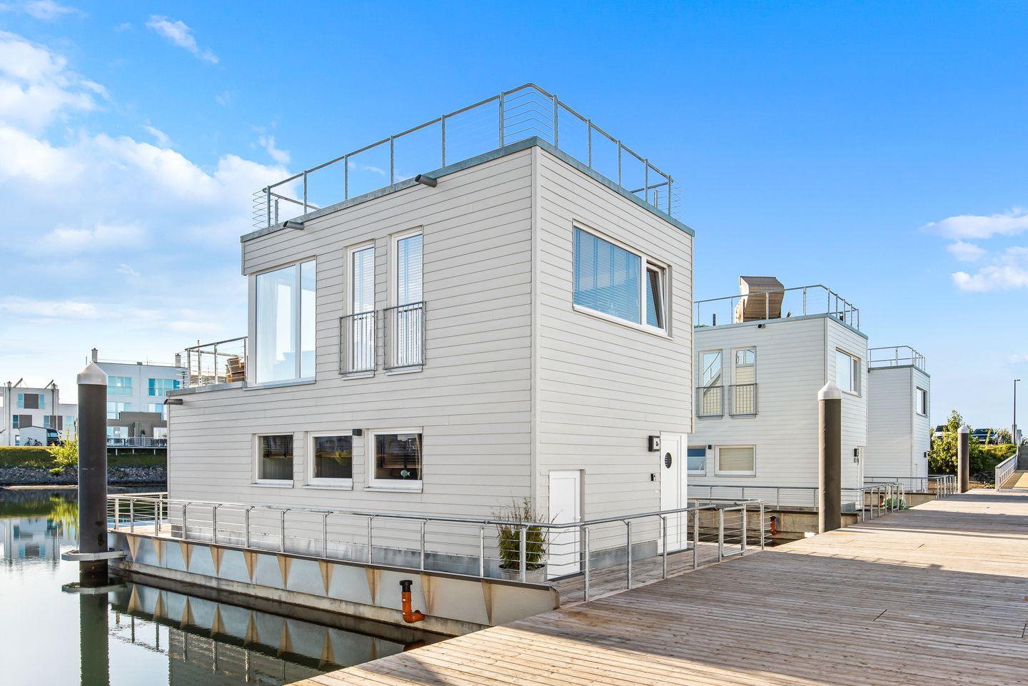 Erleben Sie das schwimmende Wasserhaus "Treibholz" mit Dachterrasse, Sauna und Ostseeblick im Ostseeresort Olpenitz.