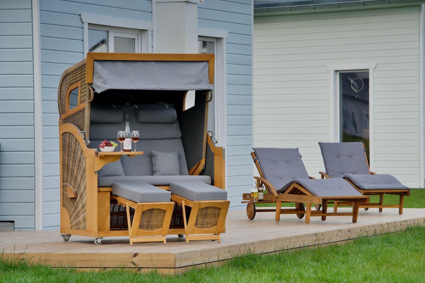 An sonnigen Tagen kannst Du es Dir auf der großen, wunderschönen, möblierten Terrasse gemütlich machen. Die Terrasse umfasst insgesamt eine Größe von 48 m². Genieße den Blick ins Grüne an lauen Sommerabenden im Strandkorb, veranstalte gemütliche Grillabende oder lasse auf der Sonnenliege einfach die Seele baumeln.