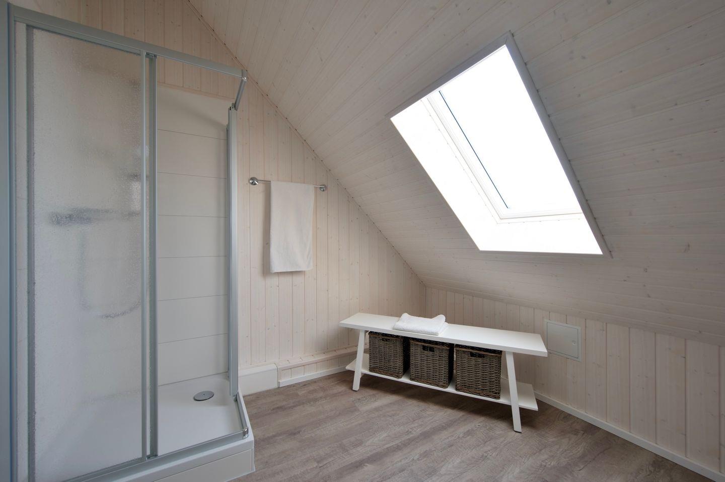 Im Obergeschoss findest Du ein weiteres Schlafzimmer mit großem Doppelbett (180 x 200 cm), einem Smart-TV und einem Schlafsofa. Bei allen Betten handelt es sich um gemütliche Boxspringbetten. Damit einem erholsamen Schlaf nichts im Wege steht, verfügen alle Zimmer über eine Verdunkelungsmöglichkeit. Zudem befindet sich im Obergeschoss ein zweites Bad mit Fenster mit Sichtschutz, Handtuchheizkörper sowie einer Dusche und einem Föhn.
