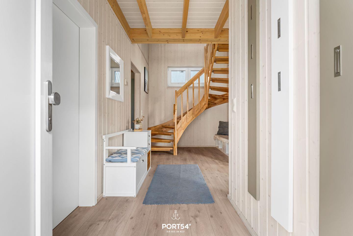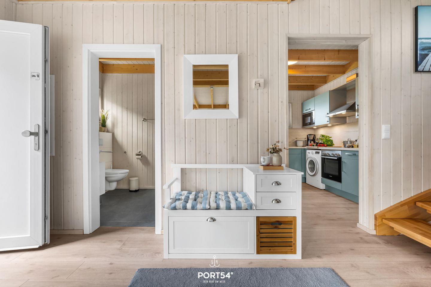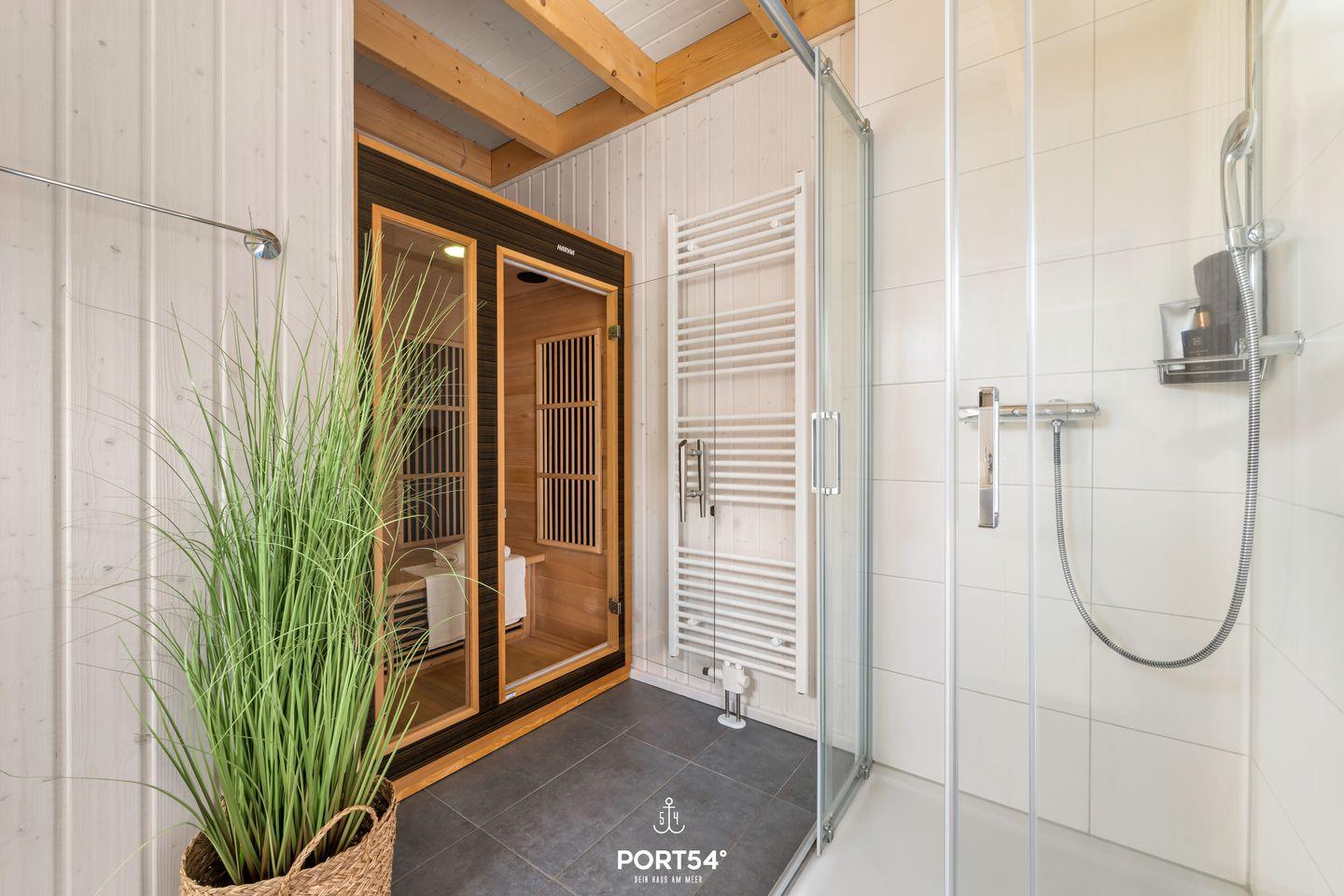 Ein Badezimmer befindet sich im Erdgeschoss und ist mit einer ebenerdigen Dusche, einem Handtuchtrockner und dem Highlight: einer Infrarot-Sauna ausgestattet. Hier kannst Du Dich an kalten Tagen aufwärmen und entspannen! Das andere Badezimmer im ersten Obergeschoss bietet eine Duschwanne, ebenfalls einen Handtuchtrockner sowie einen Föhn.