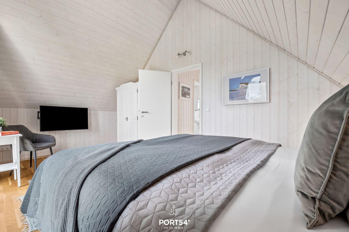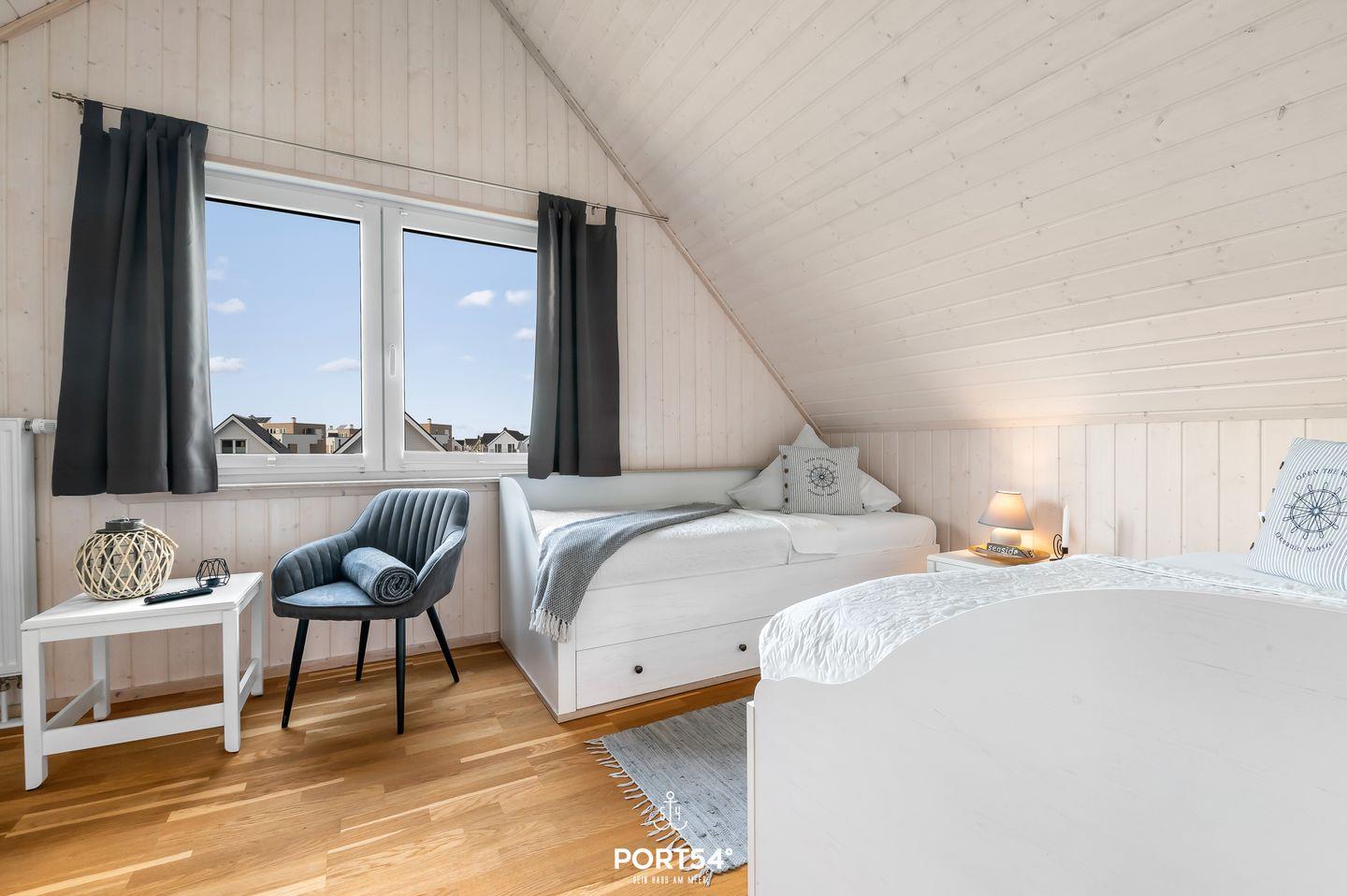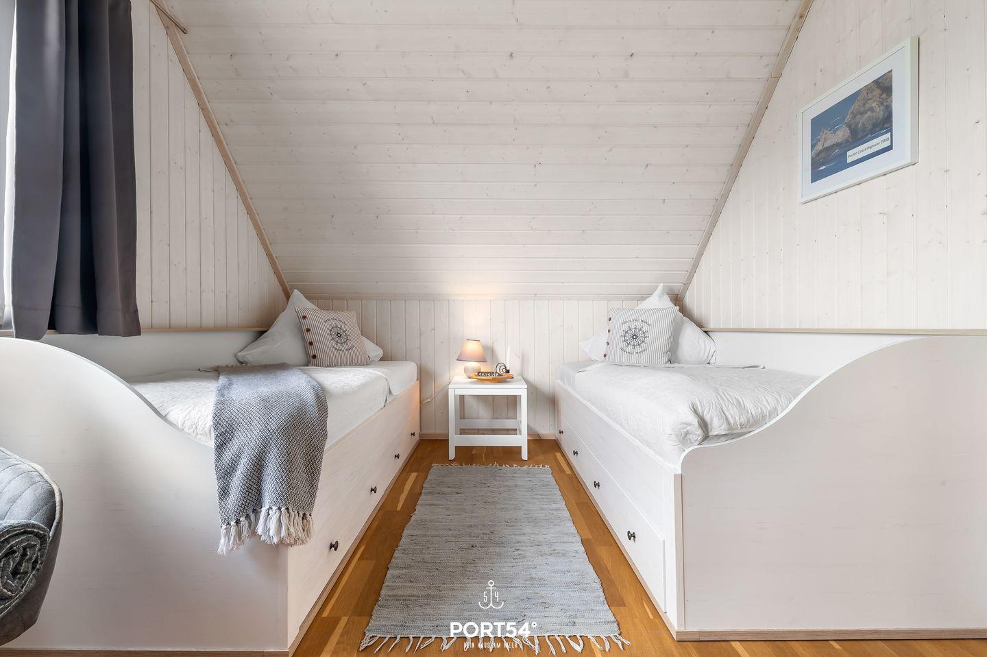 Im Obergeschoss erwarten Dich zwei geschmackvoll eingerichtete Schlafzimmer, beide mit Smart-TV ausgestattet. Ein Zimmer bietet ein komfortables Doppelbett (180 x 200 cm), das andere ist mit zwei Einzelbetten (je 90 x 200 cm) ausgestattet. Beide Räume garantieren dank Verdunkelungsmöglichkeiten erholsame Nächte.