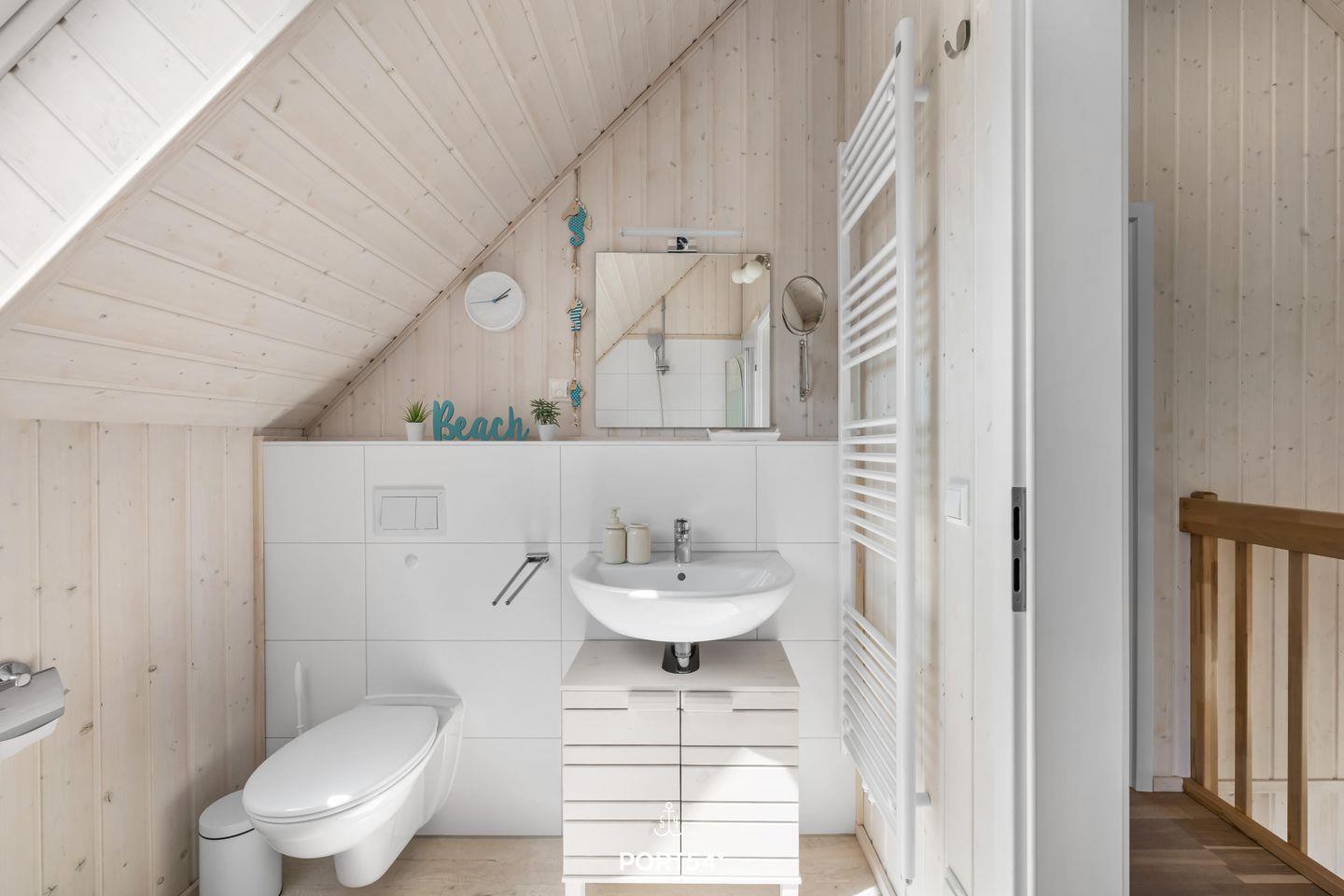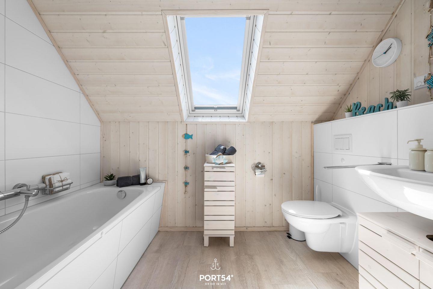 Im Badezimmer im Obergeschoss findest Du eine Duschwanne, ein WC, einen beleuchteten Spiegel und ein Dachfenster mit Sichtschutz.