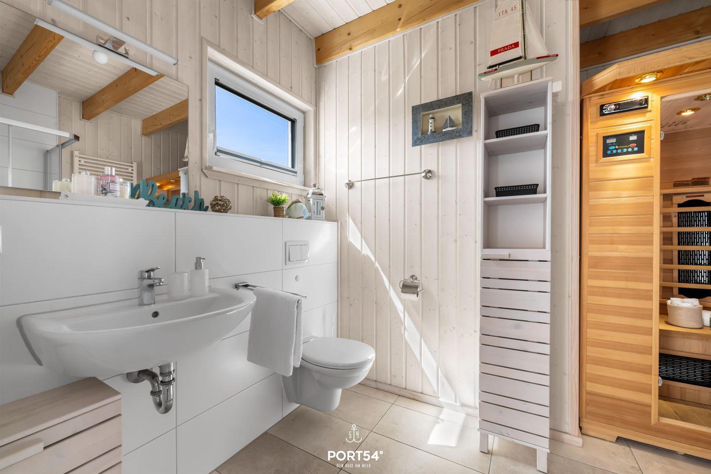 Die beiden modernen Badezimmer lassen keine Wünsche offen. Im Erdgeschoss erwartet Dich ein wahres Wellness-Erlebnis: eine luxuriöse Dusche mit Regendusche, ein Föhn, ein WC und ein beleuchteter Spiegel. Das Highlight ist die Infrarotsauna, die für wohltuende Entspannung sorgt. Genieße die Wärme der Infrarotstrahlen und gönne Dir eine kleine Auszeit. Ein Handtuchheizkörper und ein Radio sorgen für zusätzlichen Komfort, während das Fenster mit Sichtschutz Privatsphäre garantiert.