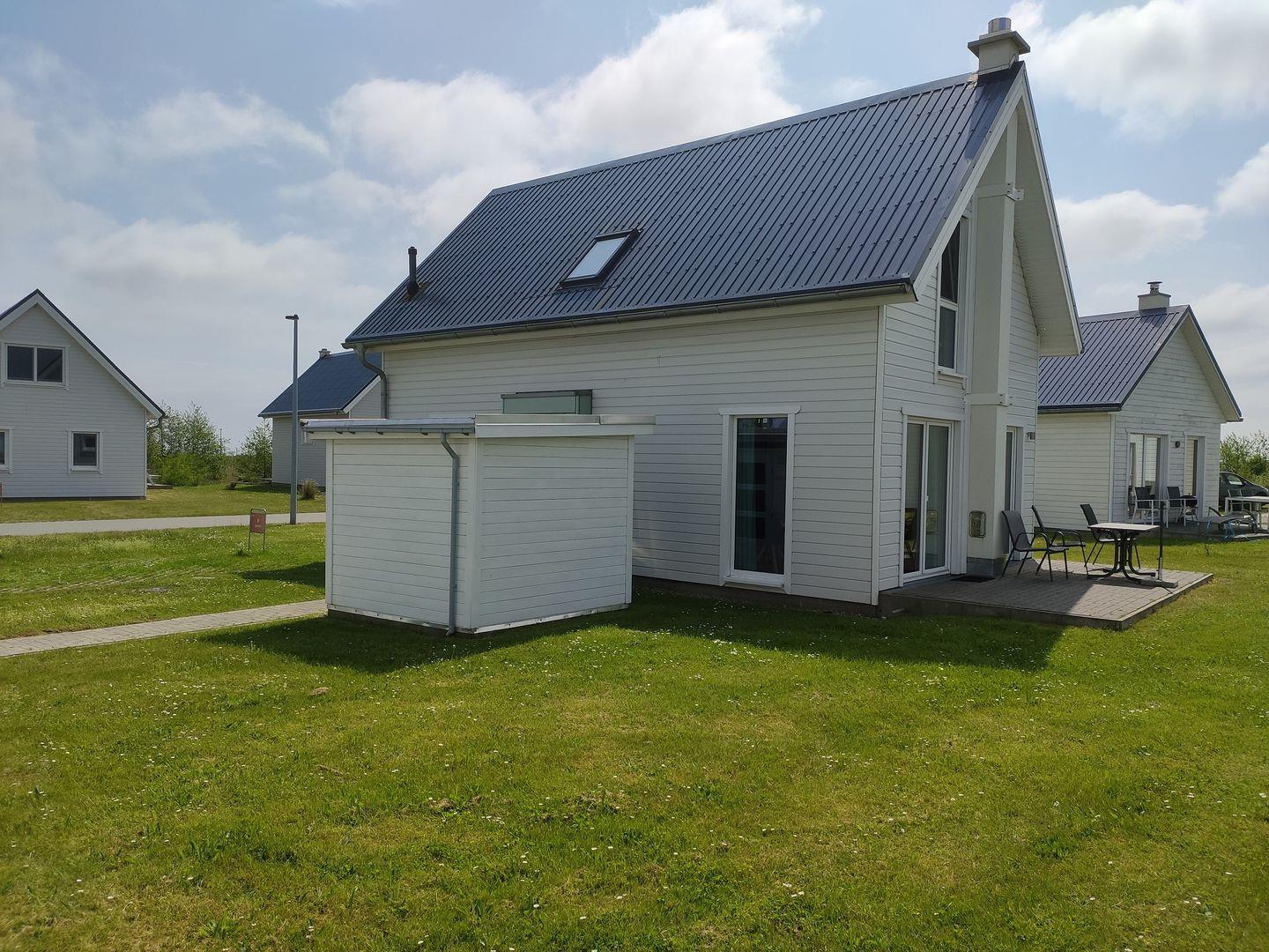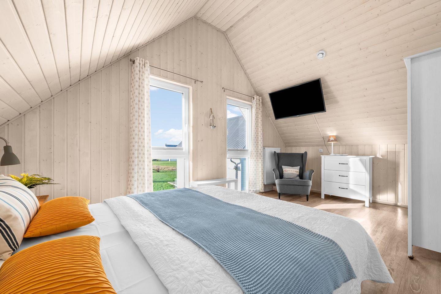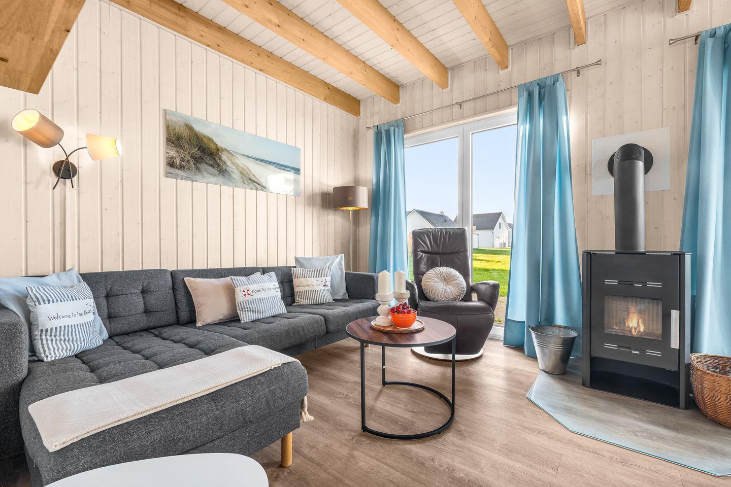 Das Ferienhaus bietet einen offenen Wohn- und Essbereich mit Kamin, voll ausgestatteter Küche, zwei Schlafzimmer, zwei Badezimmer und eine Terrasse. Das eine Schlafzimmer verfügt über ein Doppelbett und das andere Schlafzimmer drei Einzelbetten. Die Bäder sind mit einer Dusche, einer Badewanne und einer Infrarot-Sauna ausgestattet. Auf der Terrasse gibt es Gartenmöbel, einen Sonnenschirm und einen Holzkohlegrill. Ein Außenstellplatz und ein abschließbarer Fahrradschuppen befinden sich am Haus.