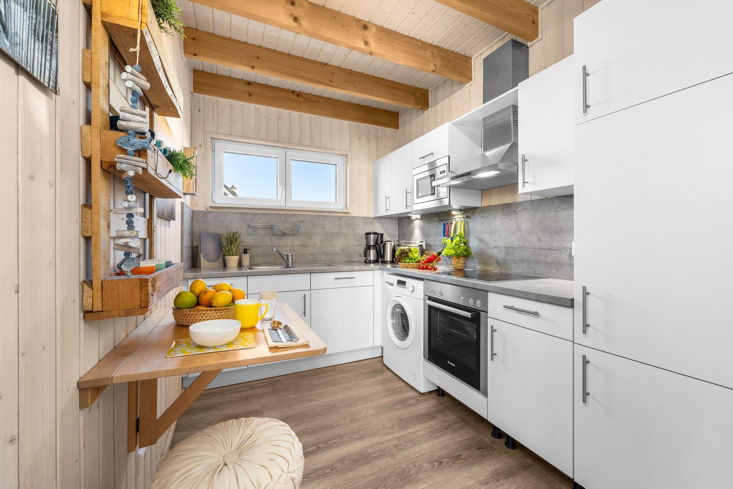 Entspanne Dich auf dem Sofa vor dem Flachbild-TV oder lasse Deine Urlaubstage auf der Terrasse ausklingen. Das Sofa kann zu einer Schlafcouch ausgezogen werden und eignet sich als Schlafmöglichkeit für ein Kind. An den kühleren Tagen sorgt der Kaminofen im Wohnbereich für eine gemütliche Wärme. In der voll ausgestatteten Küche lassen sich leckere Gerichte zaubern.
