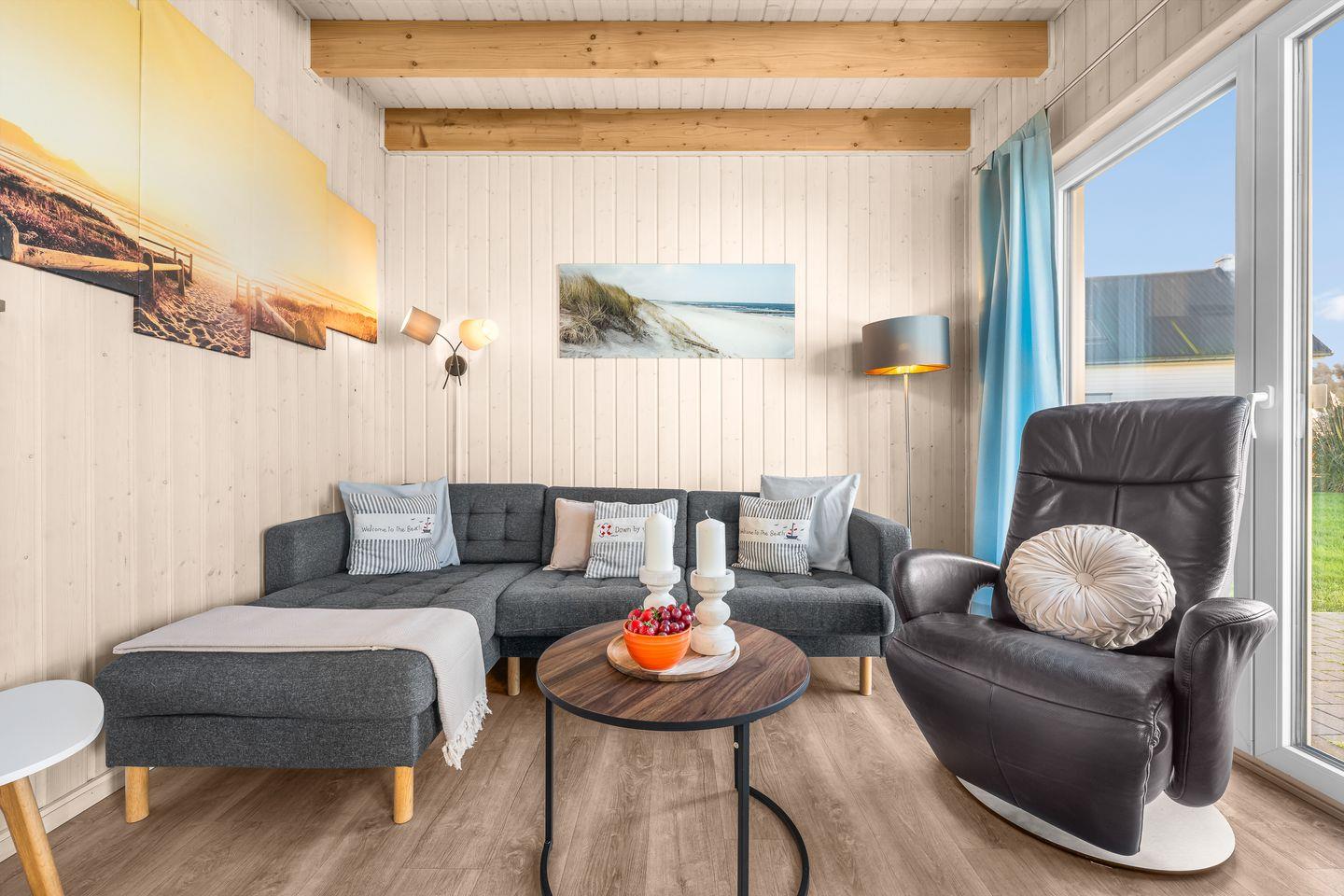 Willkommen im Haus „Trolljenta“ im OstseeResort Olpenitz! Mache Urlaub an der Ostsee! Das Ferienhaus bietet auf 80 m² einen offenen Wohn- und Essbereich mit Küche, zwei Schlafzimmer, zwei Badezimmer und eine Terrasse.