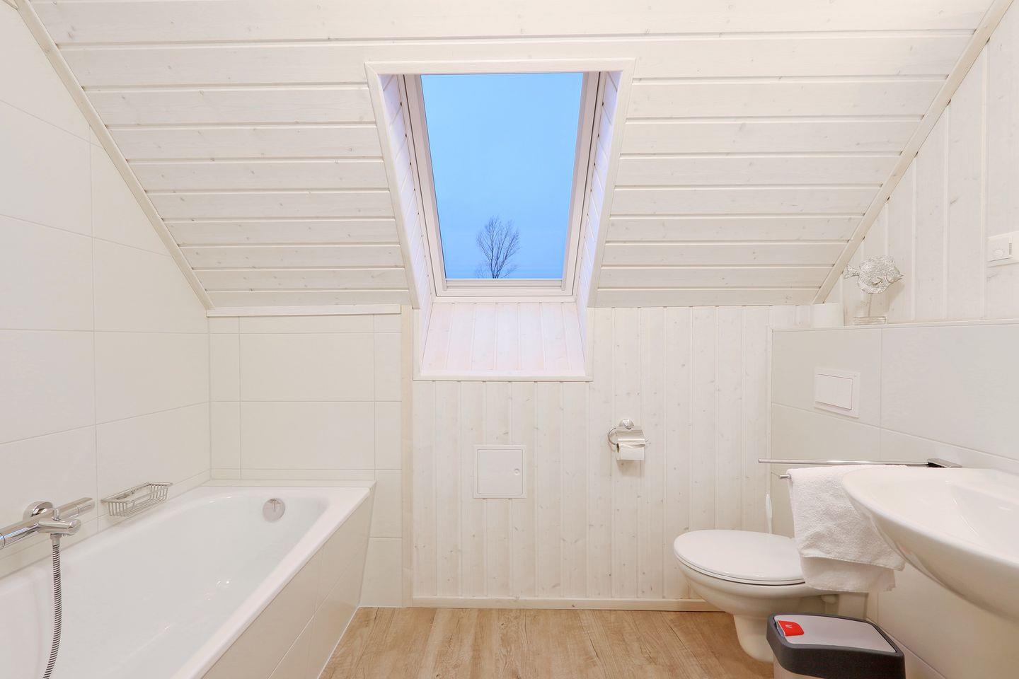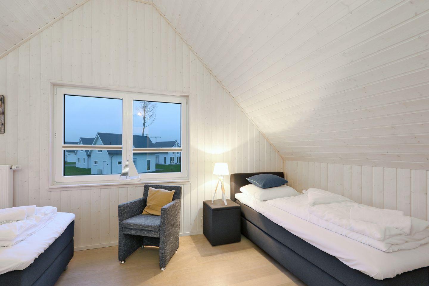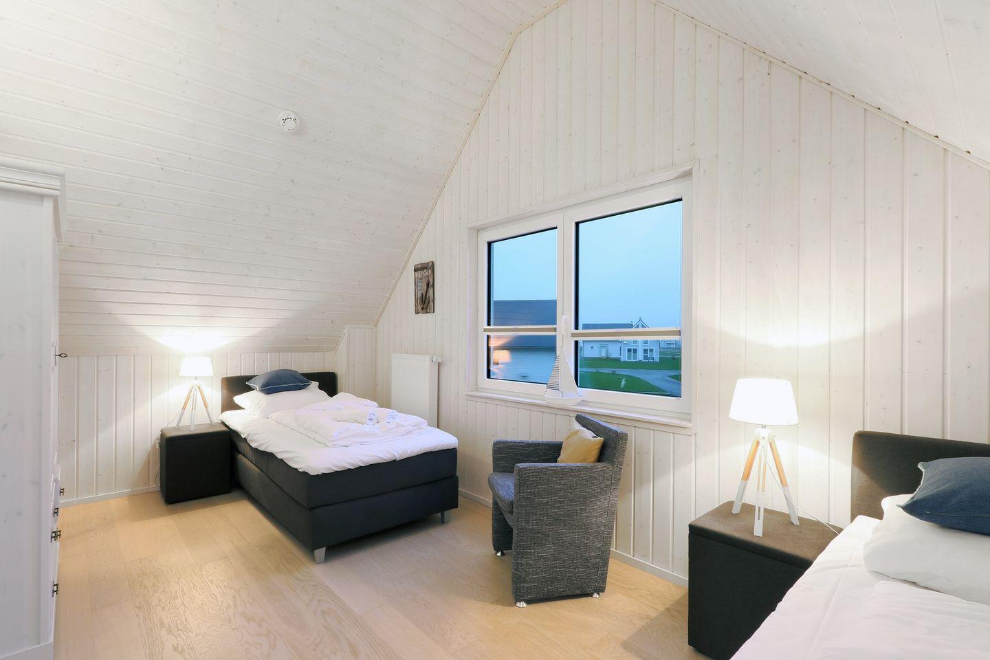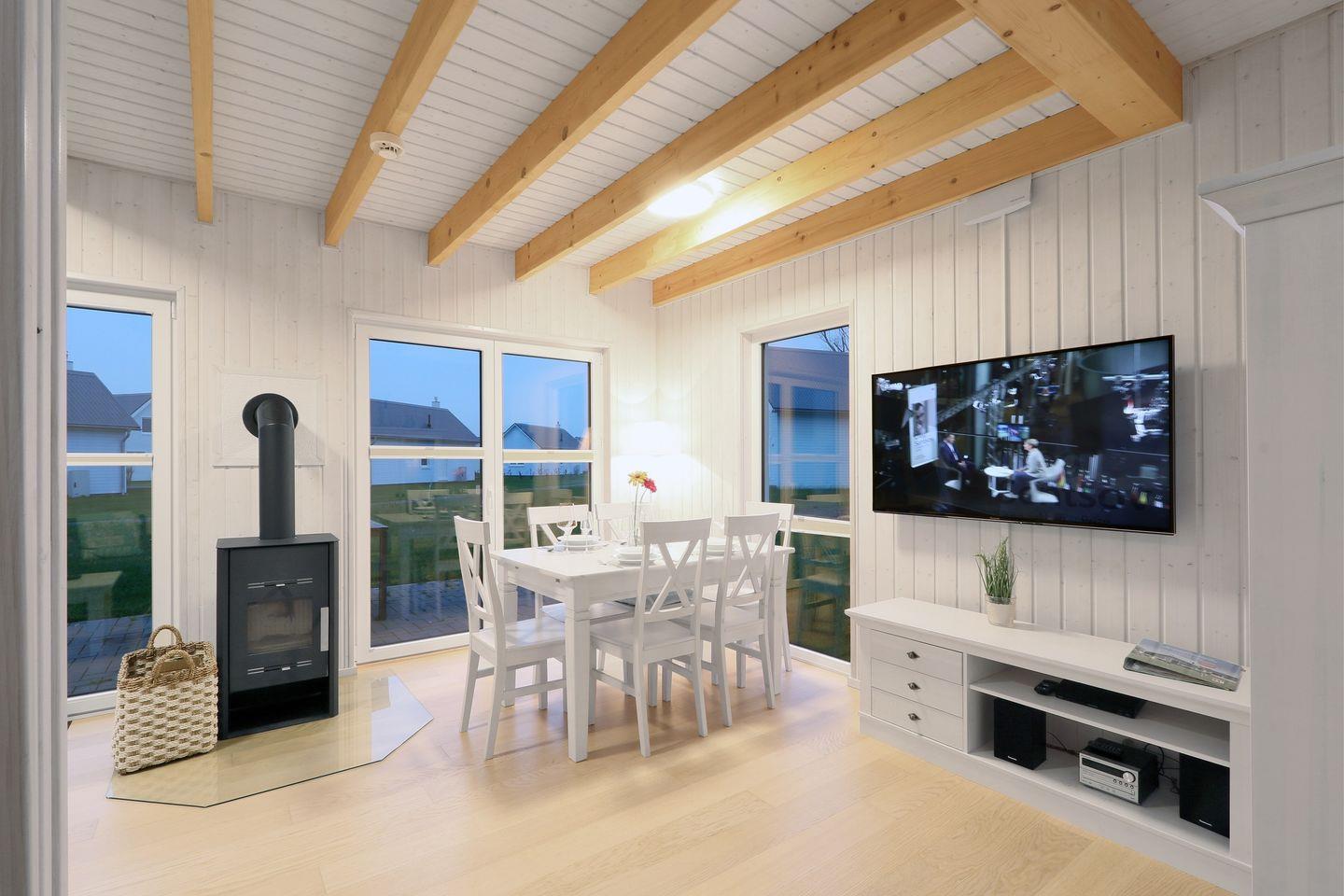 Das freistehende Ferienhaus "Fernweh" bietet auf 80m² einen offenen Wohn-Essbereich mit Kamin und Schlafsofa. Große Fenster sorgen für viel Licht. Die Küche ist voll ausgestattet. Im Erdgeschoss befindet sich ein großzügiges Bad mit Dusche, Handtuchheizung und Infrarot-Kabine. Im Obergeschoss gibt es zwei Schlafzimmer mit 1 Doppelbett, sowie 2 Einzelbetten. Außerdem ein weiteres Bad mit Badewanne. Die Terrasse bietet Outdoormöbel, Sonnenschirm und Holzkohlegrill. Ein Parkplatz ist vorhanden.