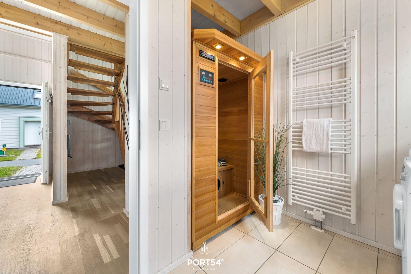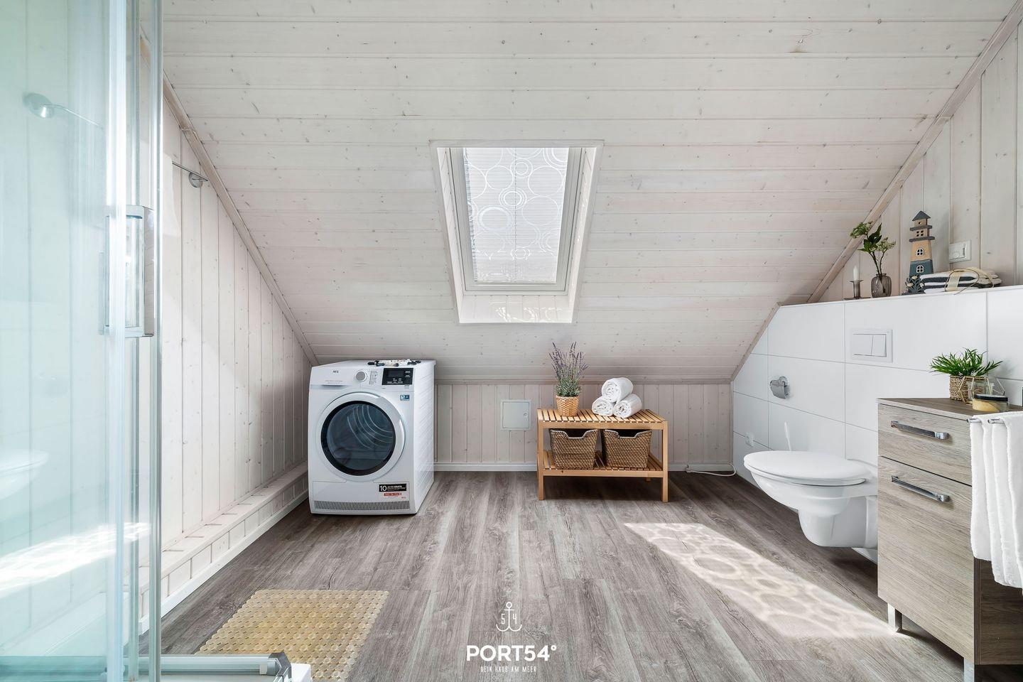 Das Badezimmer im Erdgeschoss ist mit einer Badewanne, einem Handtuchheizkörper, einer Waschmaschine und dem Highlight, einer Infrarot-Sauna, ausgestattet. Hier kannst Du Dich an kalten Tagen aufwärmen und entspannen.