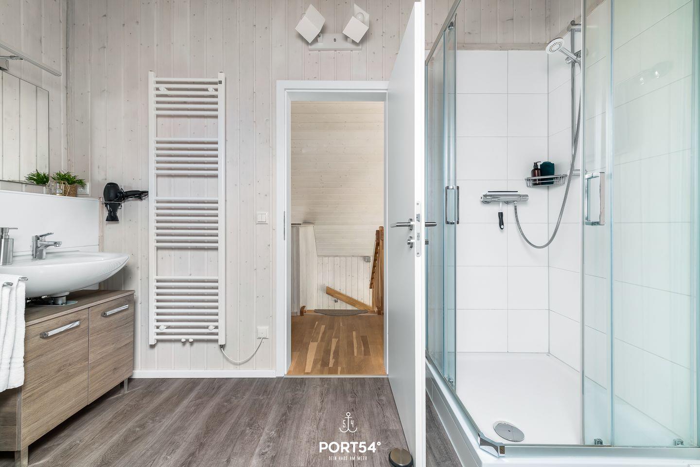 Das weitere Badezimmer im ersten Obergeschoss bietet eine Dusche, ebenfalls einen Handtuchheizkörper, einen Wäschetrockner und einen Föhn.