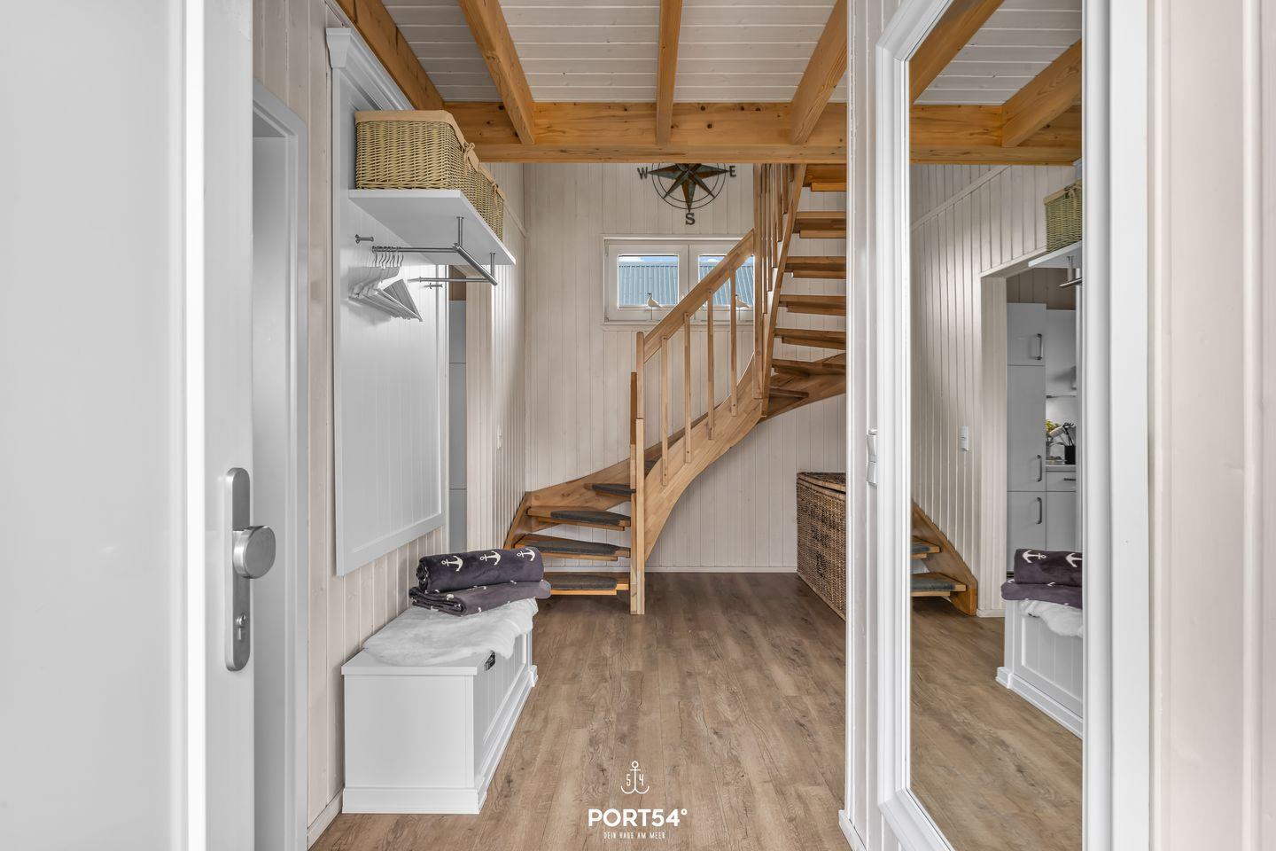 Eine geschmackvolle Treppe aus Holz führt Dich ins Obergeschoss, wo zwei liebevoll eingerichtete Schlafzimmer und ein weiteres Badezimmer auf Dich warten.