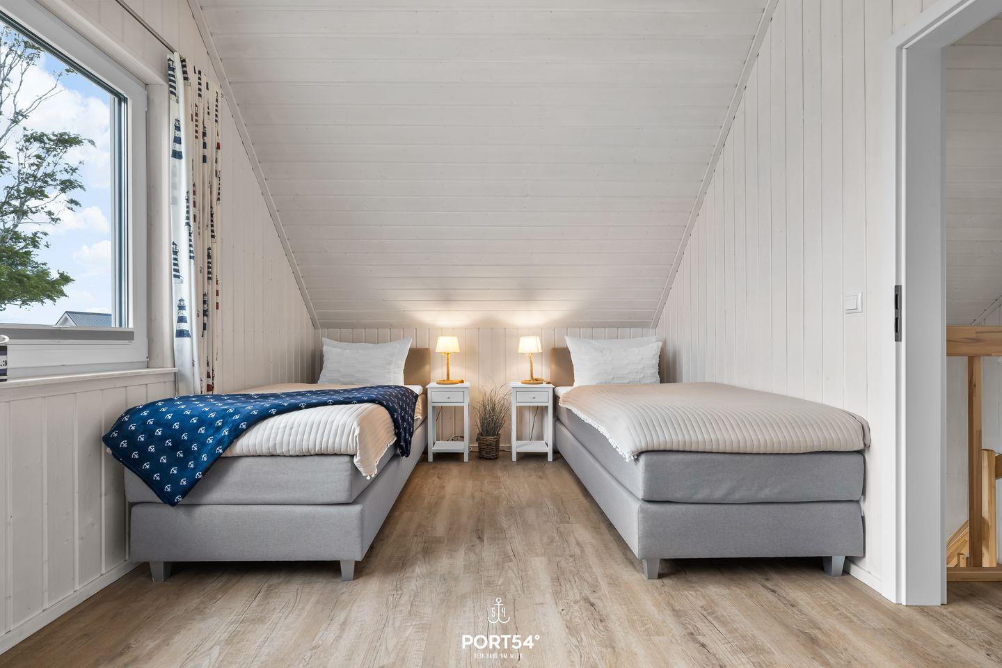 Das zweite Schlafzimmer ist mit zwei Einzelbetten (90x200 cm) ausgestattet und ebenfalls mit Insektenschutzgittern und Verdunkelungsmöglichkeiten versehen. Ein Kleiderschrank bietet zusätzlichen Stauraum.