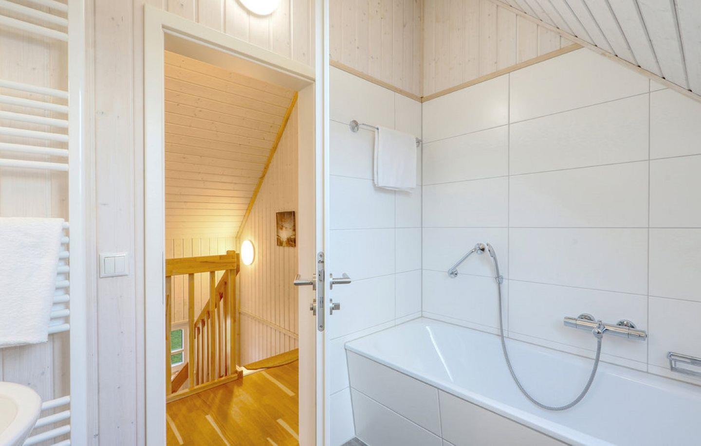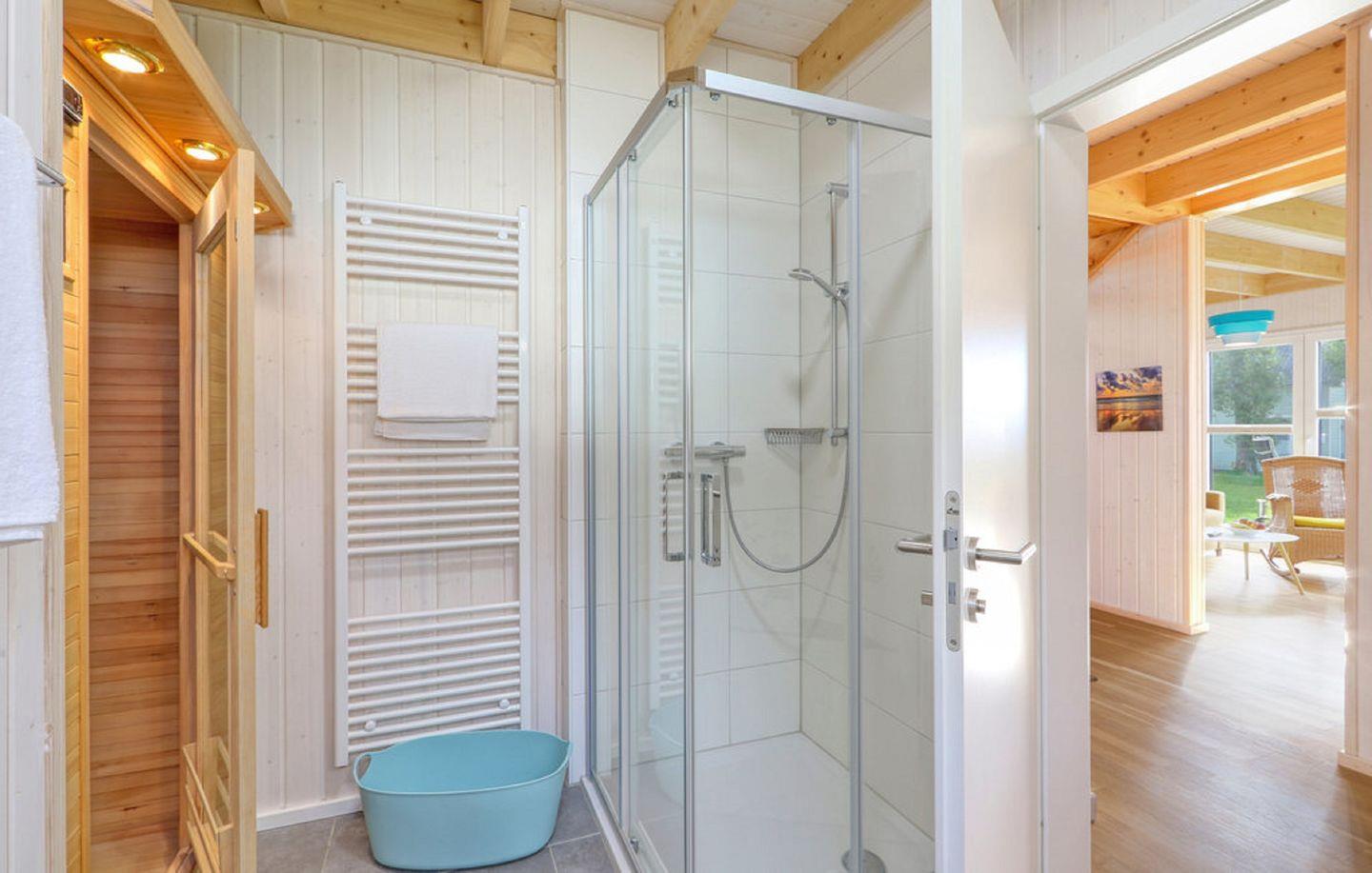 Das großzügige Badezimmer im Erdgeschoss ist mit einer ebenerdigen Dusche und als besonderes Highlight mit einer Infrarot-Sauna ausgestattet – ideal, um sich an kühleren Tagen wohlig aufzuwärmen. Im Obergeschoss bietet das zweite Badezimmer eine bequeme Badewanne und mit Duschmöglichkeit und einem Föhn.