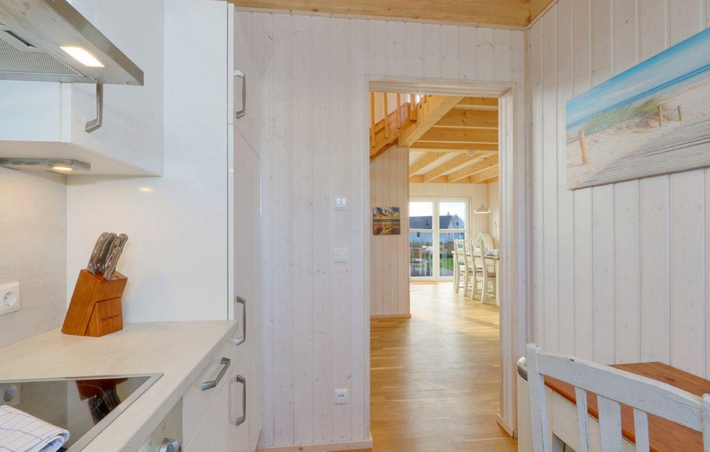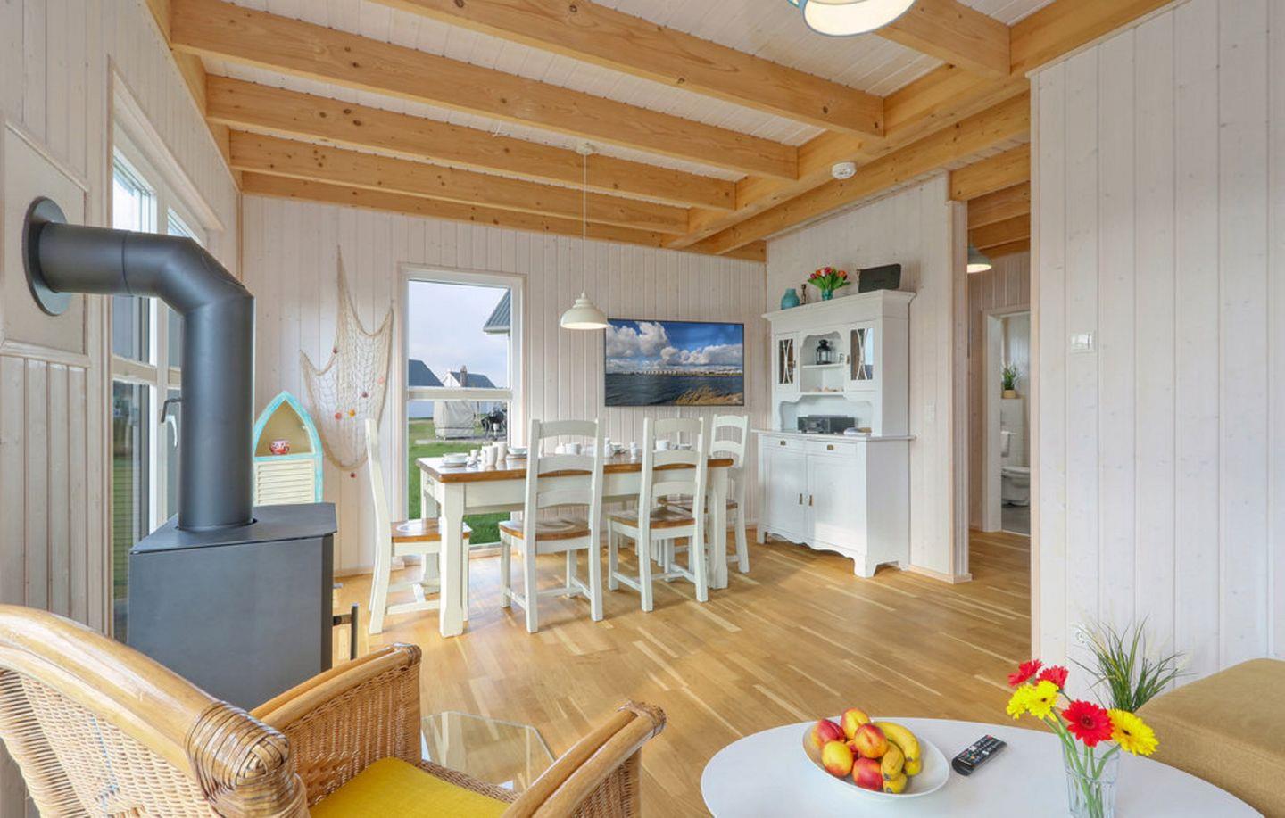Die „Villa Bullerbü“ empfängt Sie mit einem freundlichen offenen Wohn- und Essbereich, einer voll ausgestatteten Küche, zwei behaglichen Schlafzimmern und zwei modernen Bädern. Nach einem langen Strandspaziergang lädt Sie das kuschelige Sofa vor dem knisternden Kamin zum gemütlichen Entspannen ein – vielleicht mit Ihrer Lieblingsserie auf dem Flachbild-TV. Das Sofa lässt sich bei Bedarf in eine komfortable Schlafcouch verwandeln.