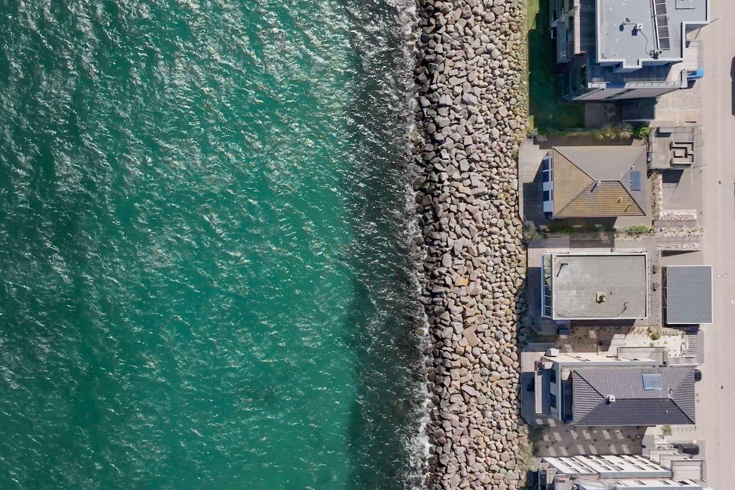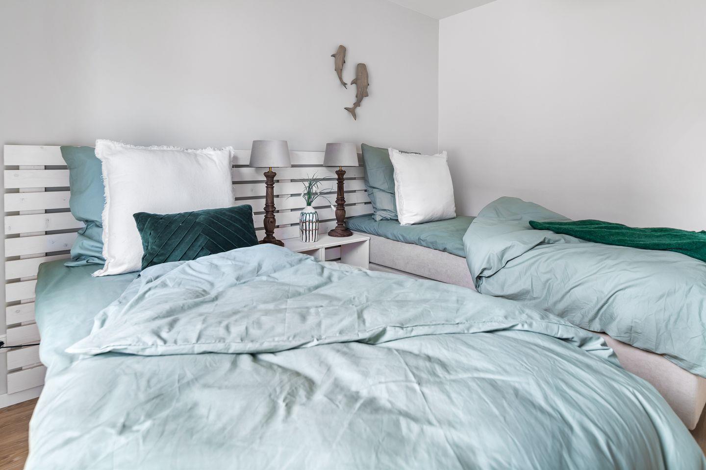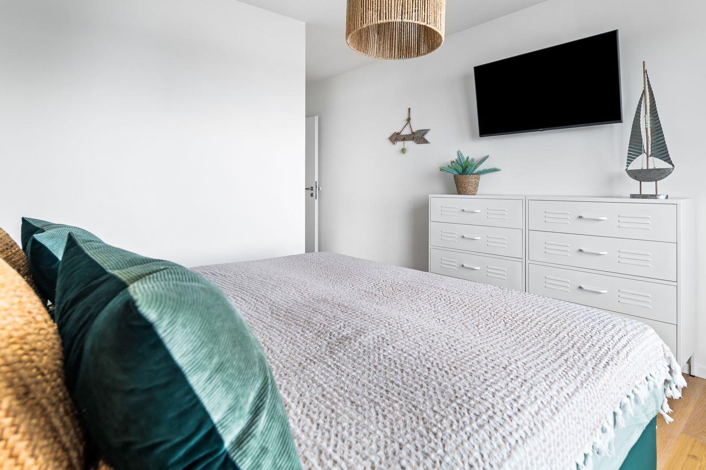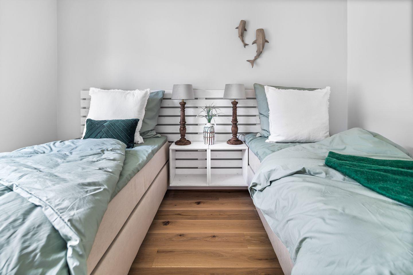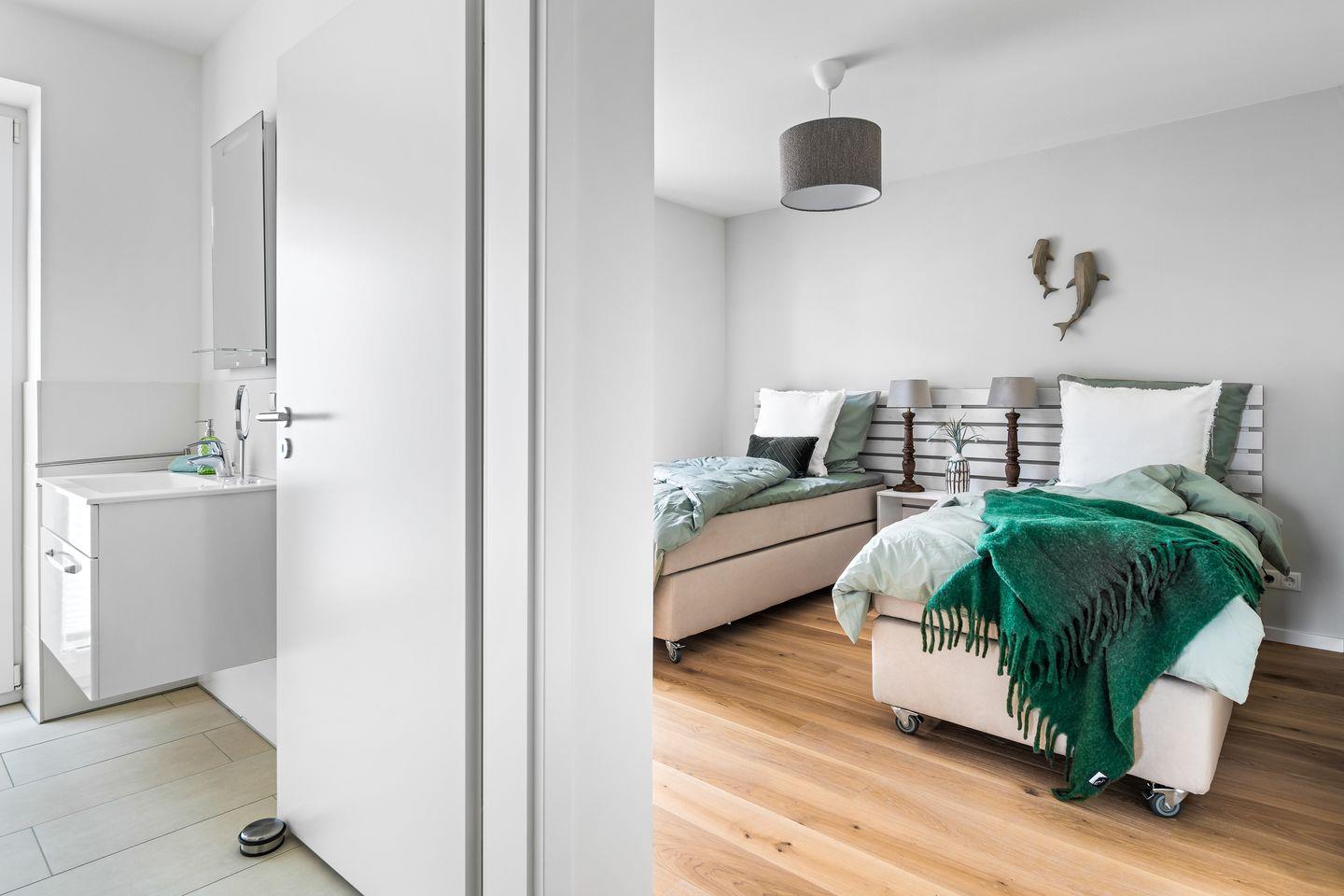 Zwei Schlafzimmer mit smarten TVs versprechen erholsamen Schlaf. Das Hauptzimmer bietet ein Doppelbett und direkten Meerblick, während das zweite Zimmer mit zwei flexiblen Einzelbetten ausgestattet ist, die sich je nach Bedarf verschieben lassen. Zwei Badezimmer mit bodengleichen Duschen sorgen für Privatsphäre und Komfort.