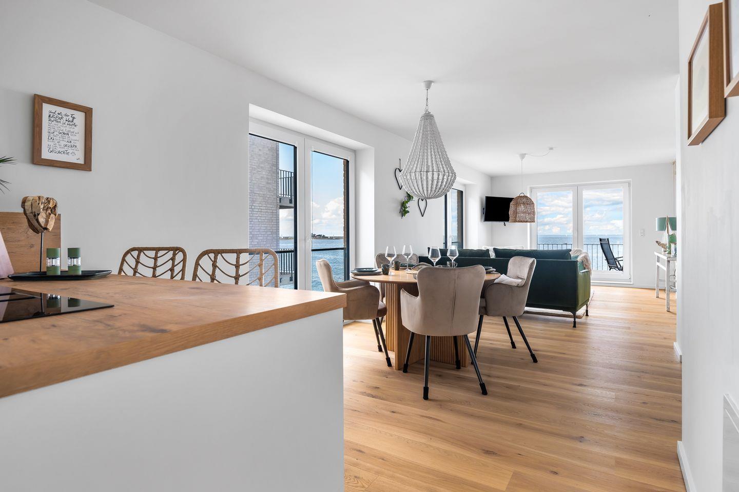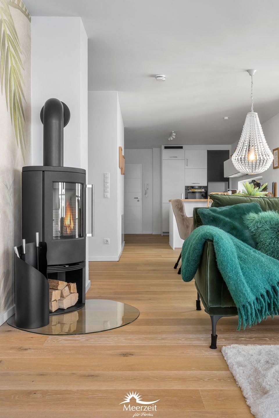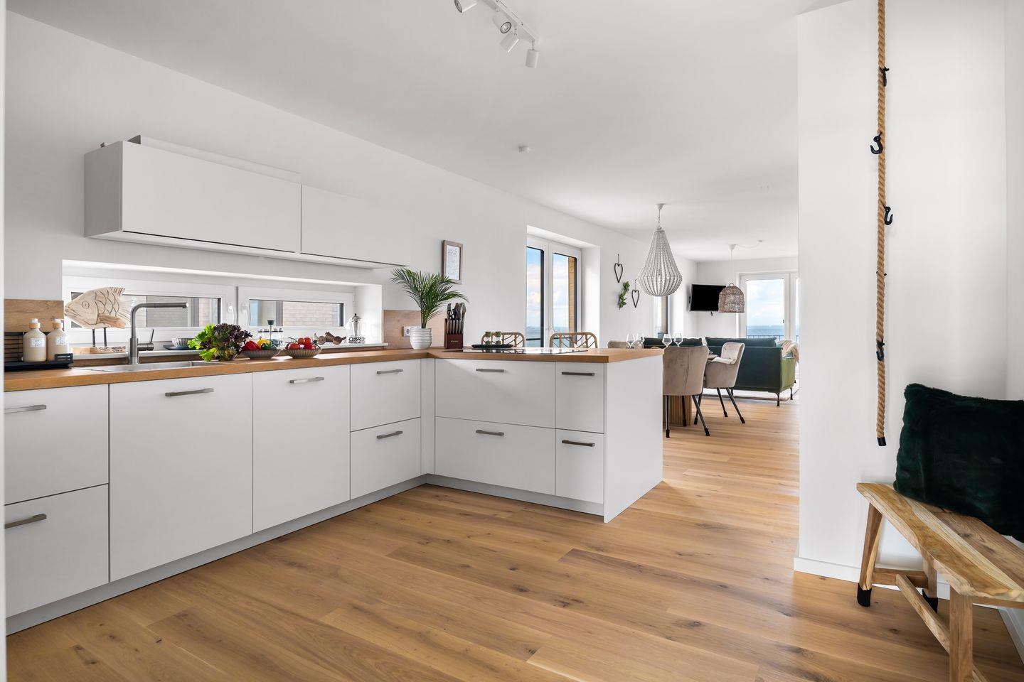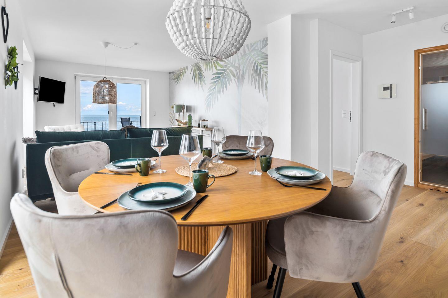 Der großzügige Wohn- und Essbereich ist mit einem weichen Samtsofa und zwei eleganten Sesseln ausgestattet sowie mit einem Kamin, ideal für entspannte Abende mit Blick auf die Ostsee. Die hochwertige Küche mit Frühstückstresen integriert sich nahtlos in den Wohnbereich und macht das Kochen zum Vergnügen. Ein runder Esstisch lädt zu geselligen Stunden ein.