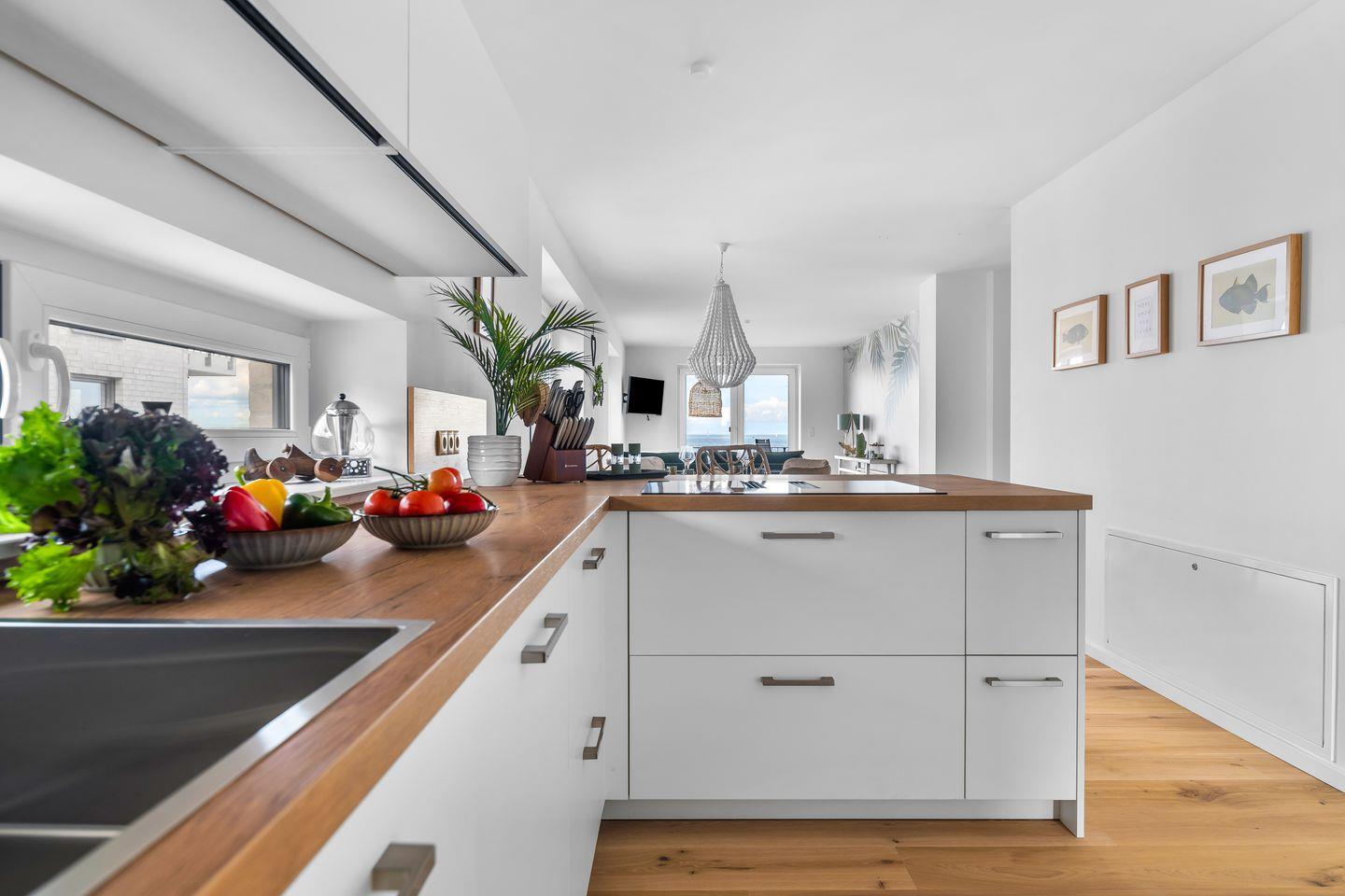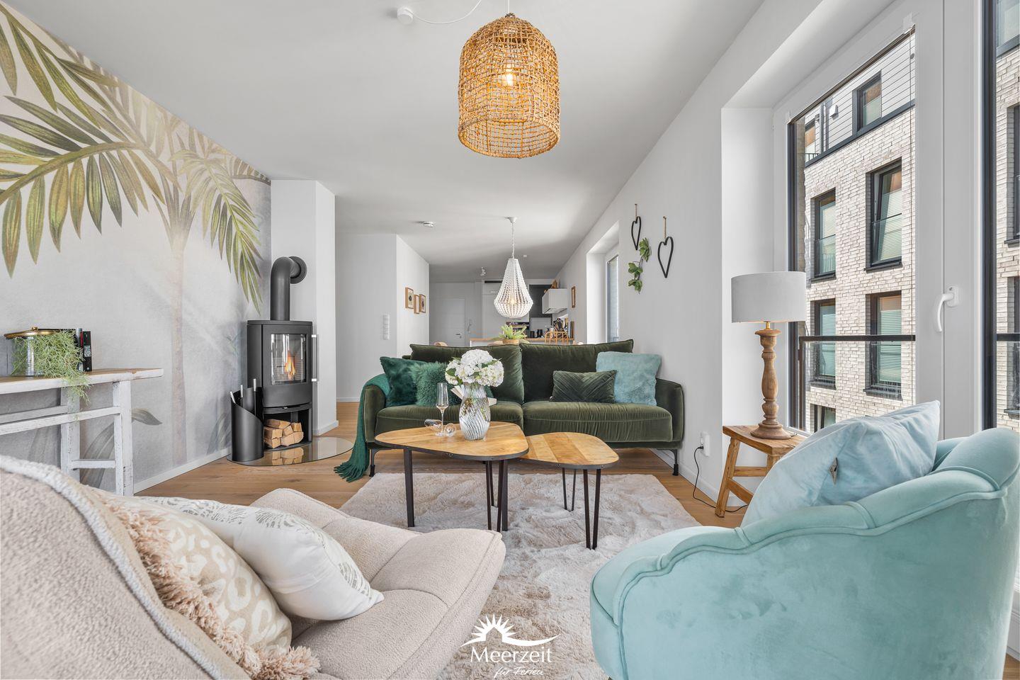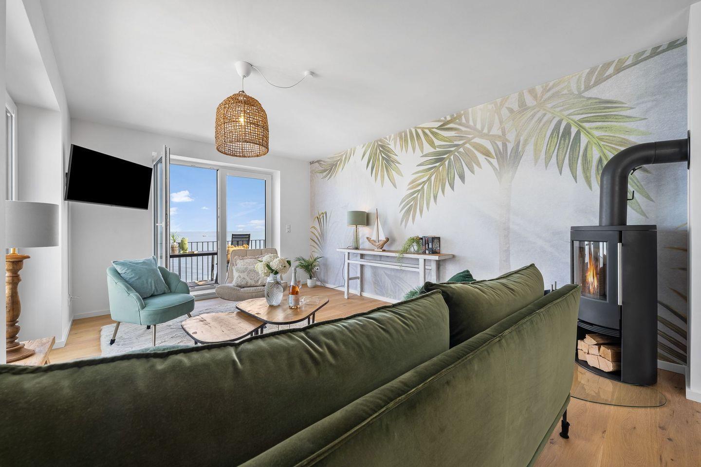 Der großzügige Wohn- und Essbereich ist mit einem weichen Samtsofa und zwei eleganten Sesseln ausgestattet sowie mit einem Kamin, ideal für entspannte Abende mit Blick auf die Ostsee. Die hochwertige Küche mit Frühstückstresen integriert sich nahtlos in den Wohnbereich und macht das Kochen zum Vergnügen. Ein runder Esstisch lädt zu geselligen Stunden ein.