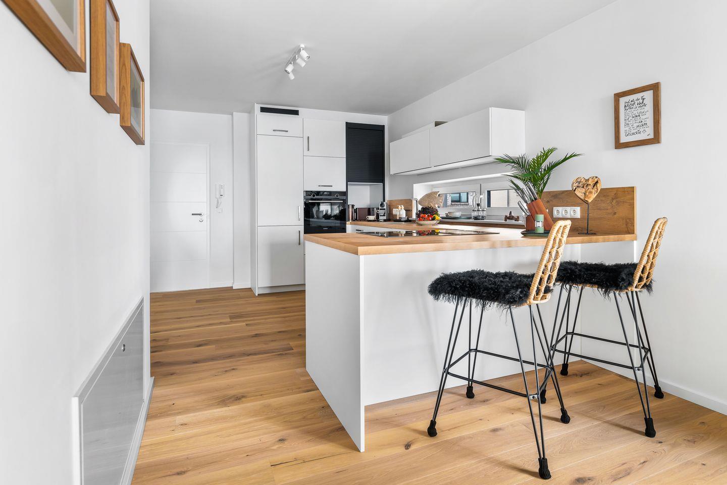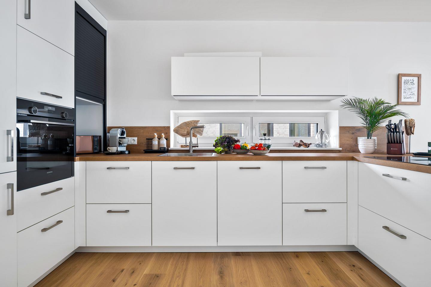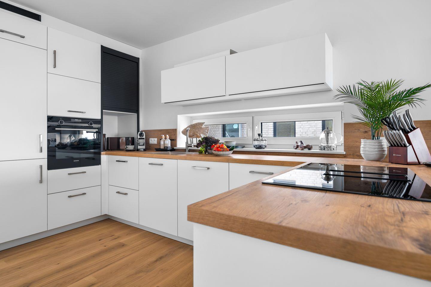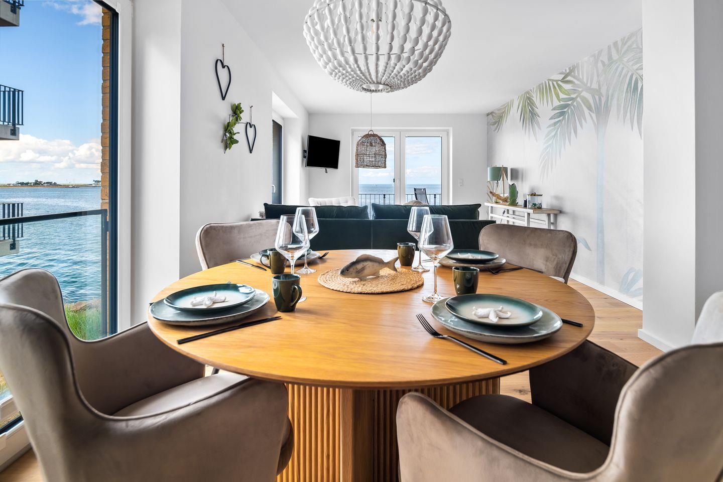 Der großzügige Wohn- und Essbereich ist mit einem weichen Samtsofa und zwei eleganten Sesseln ausgestattet sowie mit einem Kamin, ideal für entspannte Abende mit Blick auf die Ostsee. Die hochwertige Küche mit Frühstückstresen integriert sich nahtlos in den Wohnbereich und macht das Kochen zum Vergnügen. Ein runder Esstisch lädt zu geselligen Stunden ein.