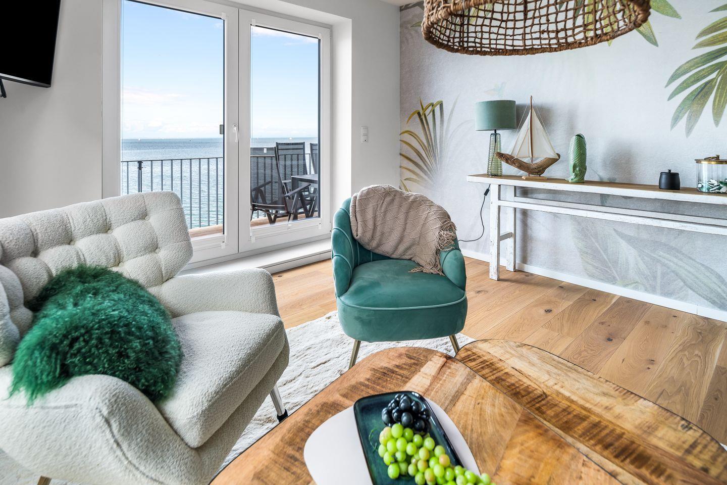 Die Ferienwohnung "Blue Paradise" vereint modernes Design mit gemütlichem Beachhouse-Charme. Bodentiefe Fenster bieten spektakulären Meerblick, während der offene Wohnbereich mit Samtsofa, Sesseln und einer voll ausgestatteten Küche zum Verweilen einlädt. Zwei Schlafzimmer mit Smart-TVs sorgen für Komfort, zwei Bäder mit bodengleichen Duschen für Privatsphäre. Eine finnische Sauna und zwei Balkone mit Strandkorb bieten Entspannung pur. Nur wenige Schritte zum Strand, Parkplatz direkt am Haus.