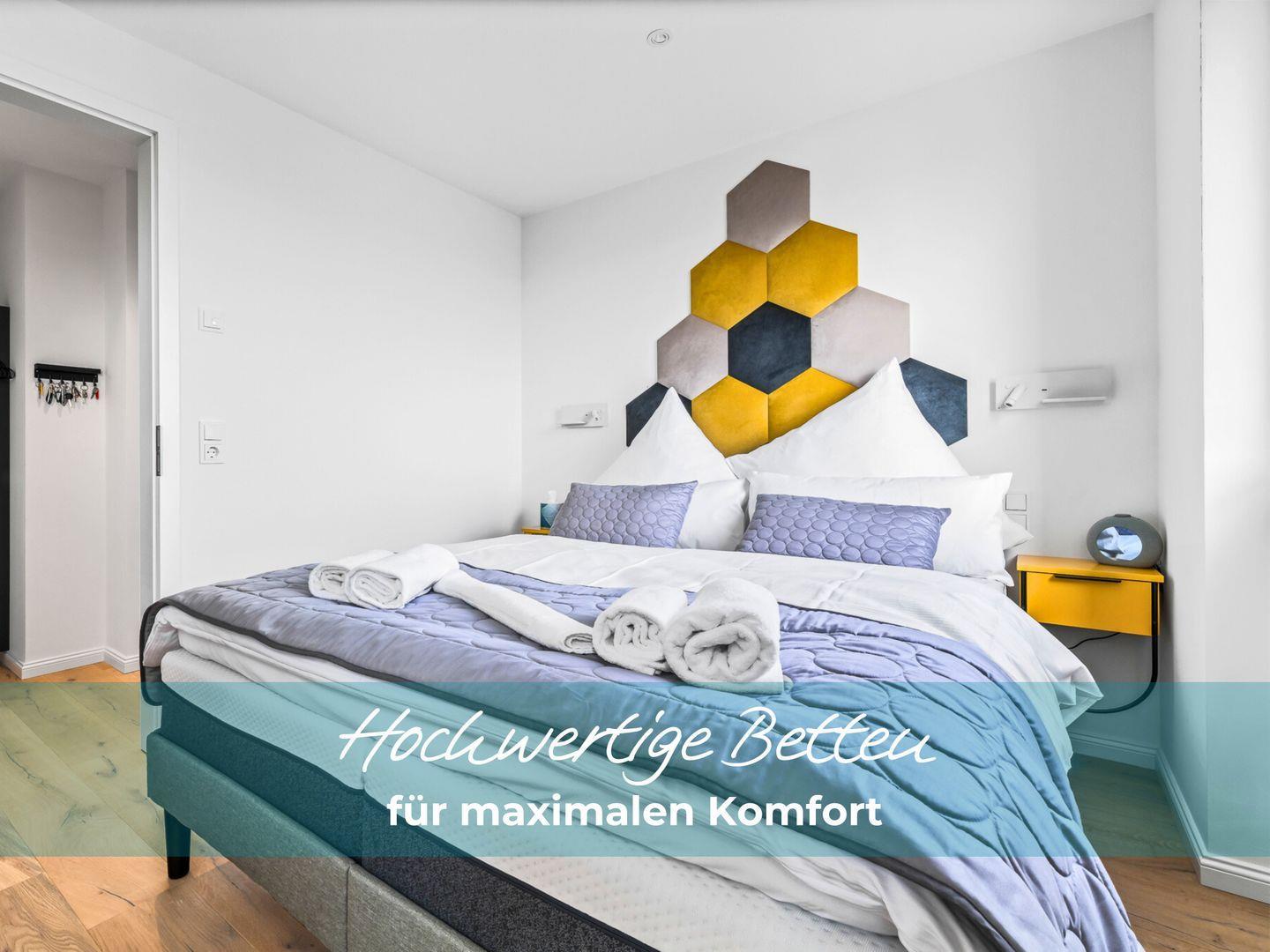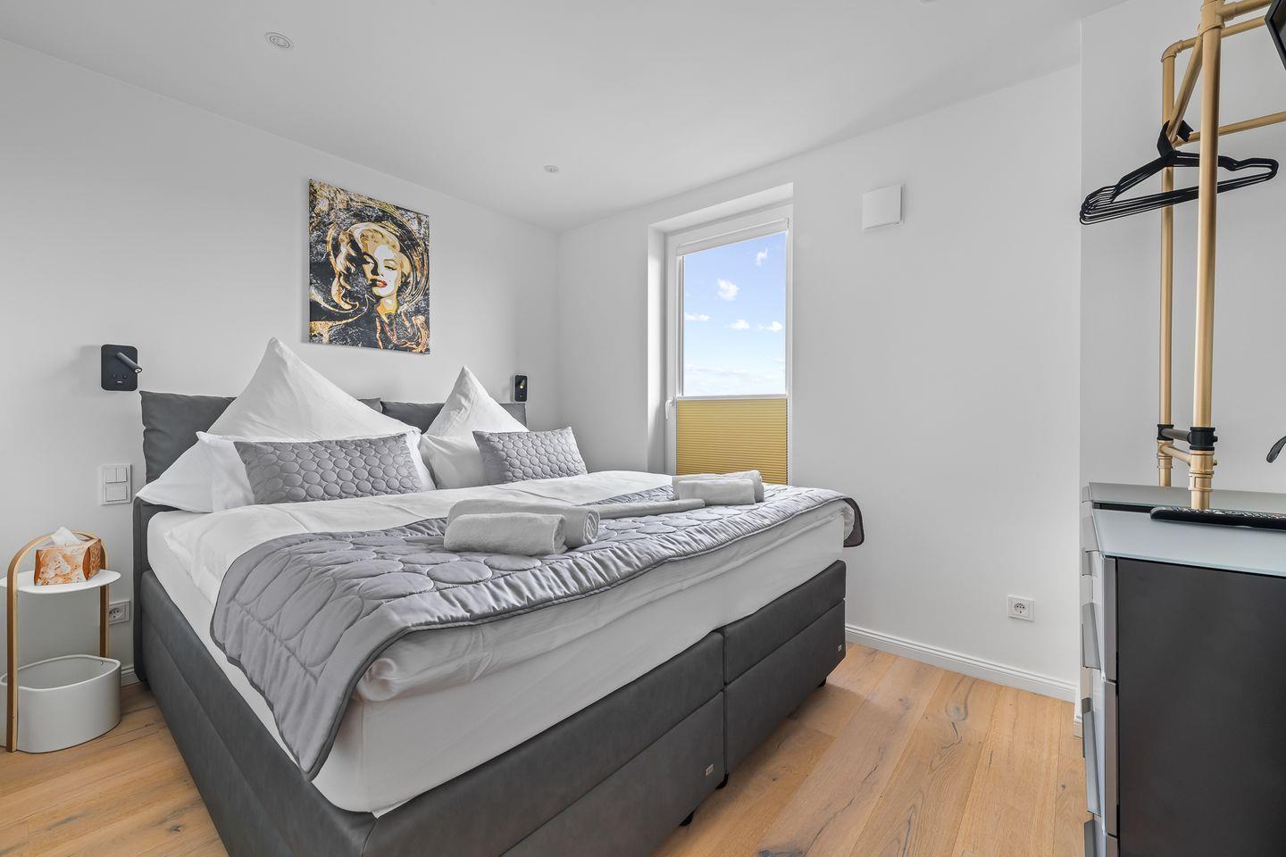 Die beiden Schlafzimmer verfügen über hochwertige Boxspringbetten in Hotelqualität, verschiedene Kissen und allergikerfreundliche Bettwäsche. Im Wohnbereich sorgt eine bequeme Récamiere mit Boxspringmatratze und Topper für einen erholsamen Schlaf. Moderne Plissees ermöglichen eine vollständige Verdunkelung der Wohn- und Schlafbereiche.