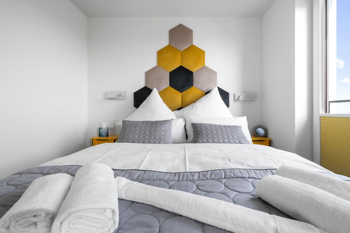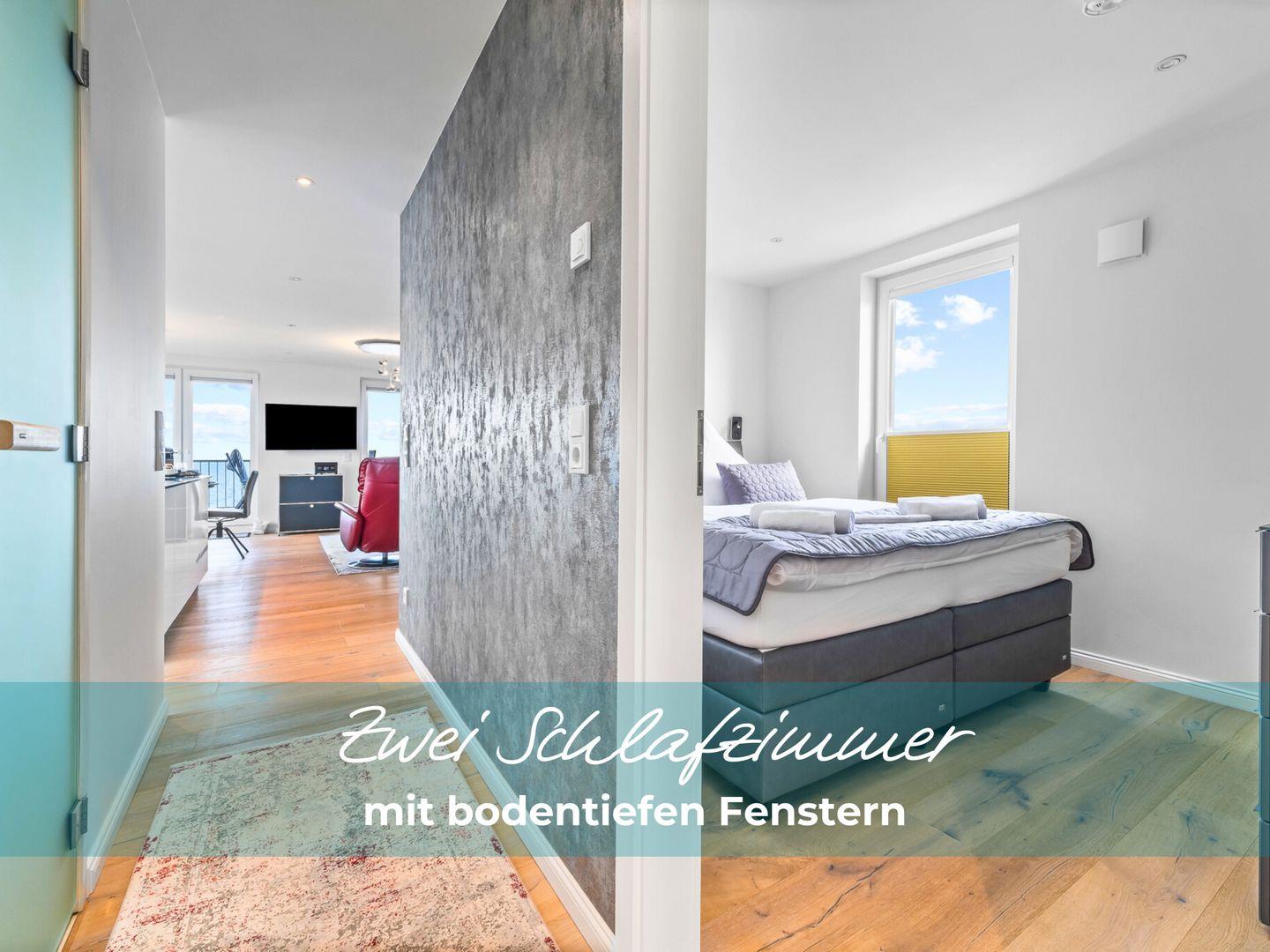 Die beiden Schlafzimmer verfügen über hochwertige Boxspringbetten in Hotelqualität, verschiedene Kissen und allergikerfreundliche Bettwäsche. Im Wohnbereich sorgt eine bequeme Récamiere mit Boxspringmatratze und Topper für einen erholsamen Schlaf. Moderne Plissees ermöglichen eine vollständige Verdunkelung der Wohn- und Schlafbereiche. Beide Schlafzimmer sind mit Fliegengittern ausgestattet.