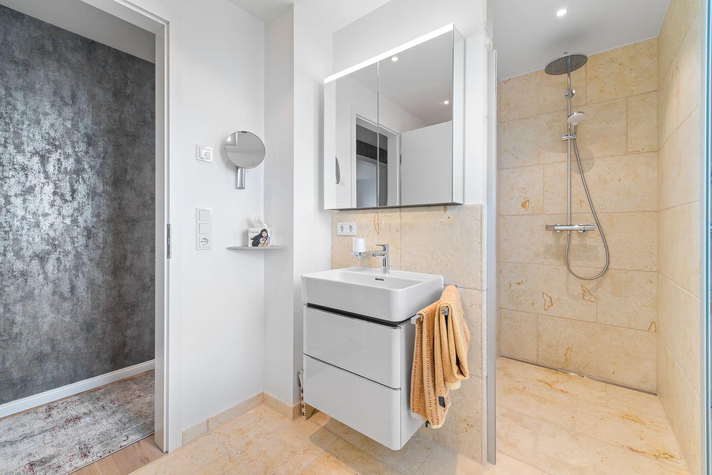 Das Badezimmer mit Meerblick erwartet Sie mit einer großzügigen bodentiefen Dusche, einem Waschtisch mit Unterschrank, einem geräumigen Spiegelschrank, WC, Sichtschutzplissees, Waschmaschine, Handtuchheizkörper und edlen Jura-Marmorfliesen. Die Fußbodenheizung sorgt für angenehme Wärme.