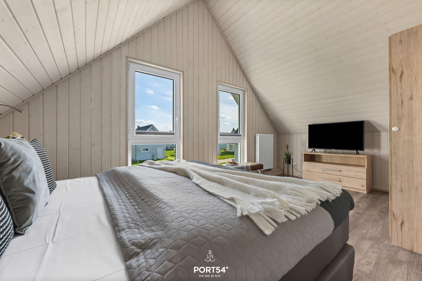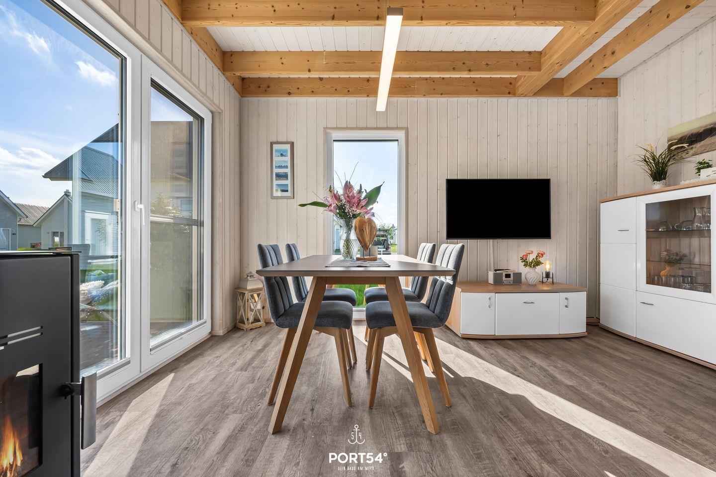 Herzlich Willkommen in Ihrem Ferienhaus "Marina Flair" in Olpenitz. Ihr freistehendes, 80m² großes Feriendomizil verfügt über einen großzügigen Wohn- und Essbereich, zwei Schlafzimmer, zwei Bäder und eine Küche. Die großen Fenster sorgen für ein lichtdurchflutetes, großzügiges Wohngefühl. Im Wohnbereich können Sie es sich auf dem Sofa gemütlich machen, ein gutes Buch lesen oder auf dem Flachbild-TV Ihre Lieblingsserie schauen. An kühlen Abenden verbreitet der Kamin eine wohlige Wärme. Die Küche bietet alles, um sich und Ihre Familie kulinarisch zu verwöhnen. Ein Bad rundet das Erdgeschoss ab. Das Badezimmer verfügt über ein Fenster mit Sichtschutz, eine Dusche, eine Handtuchheizung und als besonderes Highlight: eine Infrarotkabine. Hier können Sie sich nach langen Strandspaziergängen aufwärmen und entspannen. Für unsere kleinen Gäste steht neben einem Kinderhocker, ein Kinderreisebett sowie ein Kinderhochstuhl bereit. Im Obergeschoss befinden sich zwei Schlafzimmer. Eines der beiden Zimmer bietet ein gemütliches Boxspringbett (180x200cm) und einen Schrank, das zweite Schlafzimmer ist mit zwei Boxspringbetten (je 100x200cm), sowie ebenfalls einem Schrank ausgestattet. Beide Zimmer verfügen über Insektenschutz und Verdunkelungsmöglichkeiten, sodass einem erholsamen Schlaf nichts mehr im Wege steht. Das Bad im Obergeschoss bietet ein Dachfenster mit Sichtschutz, eine Badewanne, eine Handtuchheizung, einen Föhn und ein weiteres WC. Genießen Sie die nach Süden ausgerichtete, möblierte Terrasse um zu entspannen, Grillabende zu veranstalten oder einfach um auf der Sonnenliege die Seele baumeln zu lassen. Für Ihre mitgebrachten oder beim Tourguide gemieteten Räder steht Ihnen ein abschließbarer Schuppen zur Verfügung. Nicht nur für Ihre Zweiräder ist gesorgt: vor Ihrem Ferienhaus steht Ihnen ein Parkplatz zur Verfügung.