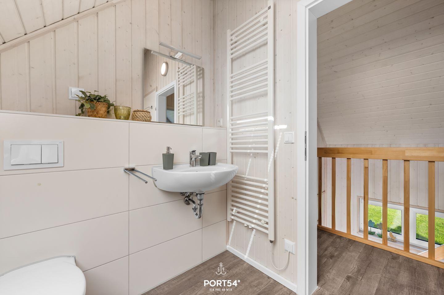 Das Bad im Obergeschoss bietet Dir ein Dachfenster mit Sichtschutz, eine Badewanne, eine Handtuchheizung, einen Föhn und ein weiteres WC.