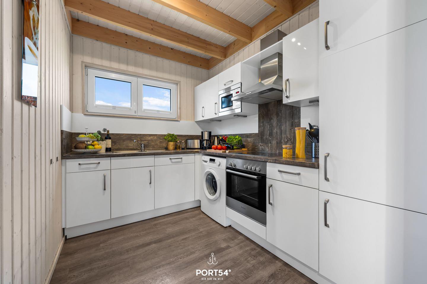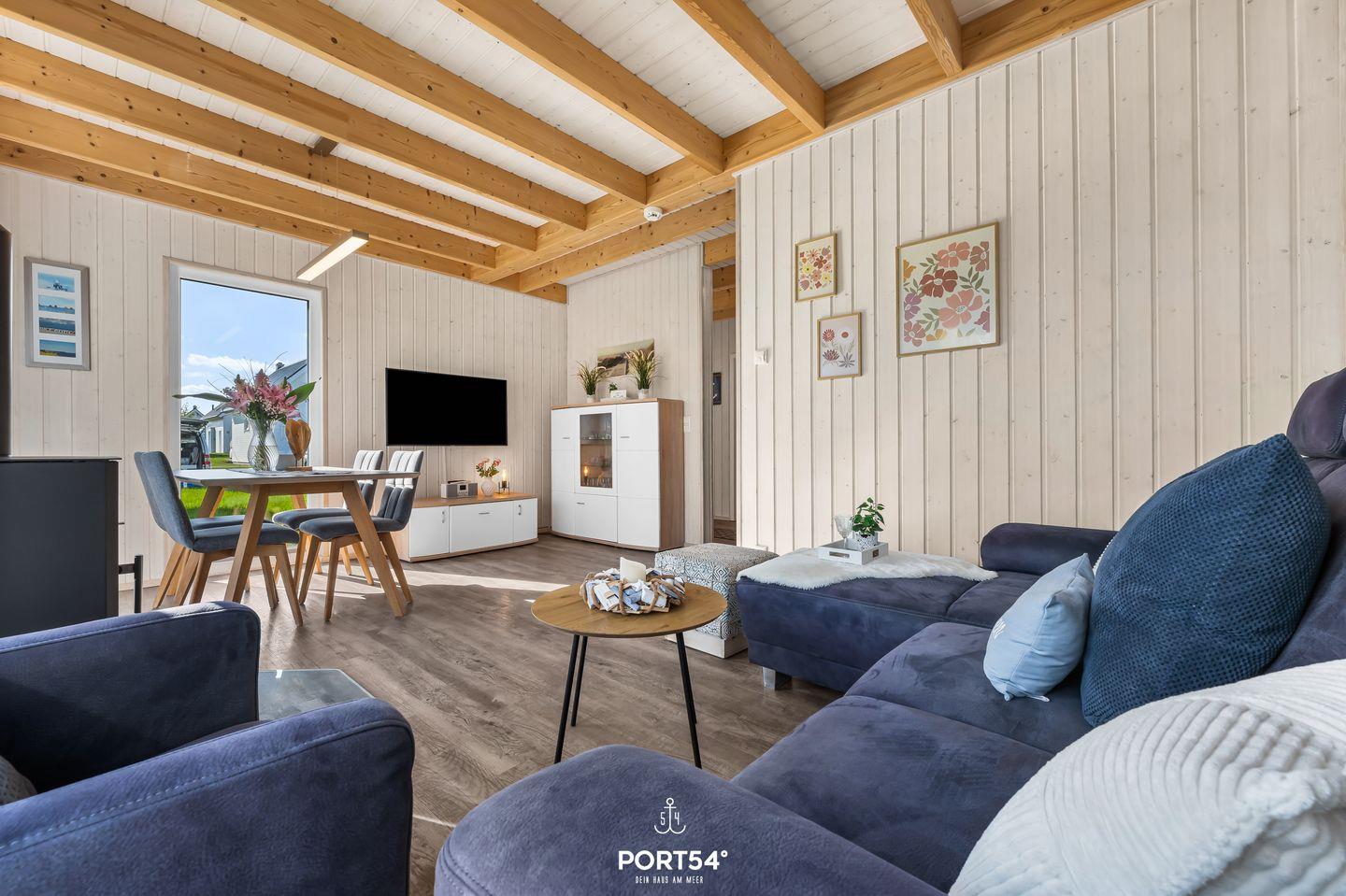 Dein freistehendes, 80 m² großes Feriendomizil verfügt über einen großzügigen Wohn- und Essbereich, zwei Schlafzimmer, zwei Bäder und eine Küche. Die großen Fenster sorgen für ein lichtdurchflutetes, großzügiges Wohngefühl.