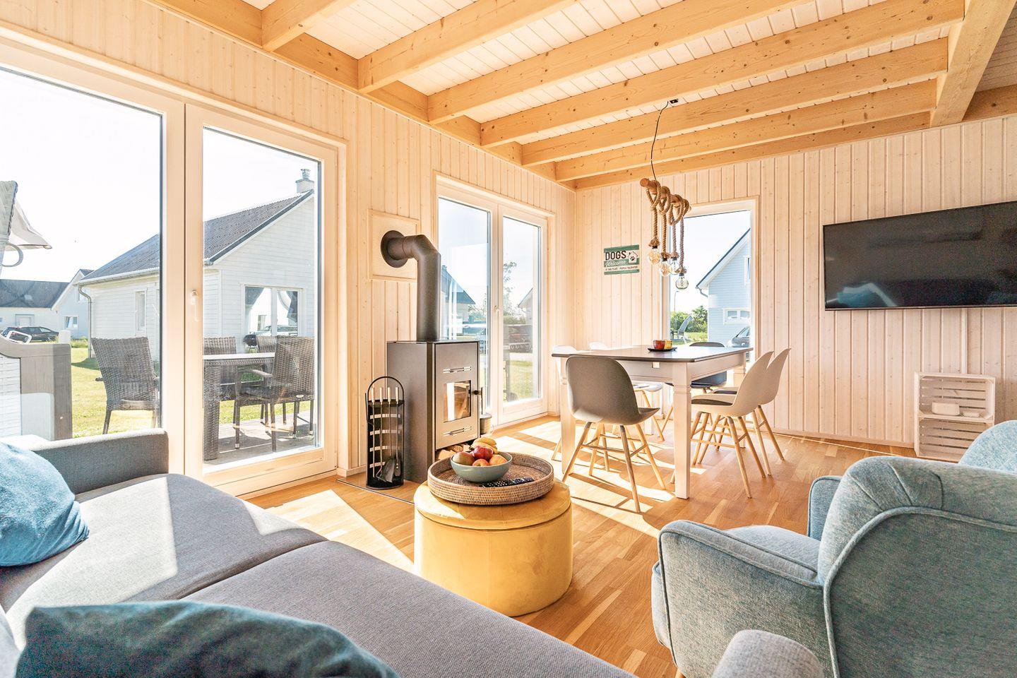 Gemütliches Ferienhaus Snorris Stuga in Olpenitz mit Sauna, Kamin, Terrasse und Strandkorb, nur 400 m vom Strand entfernt.