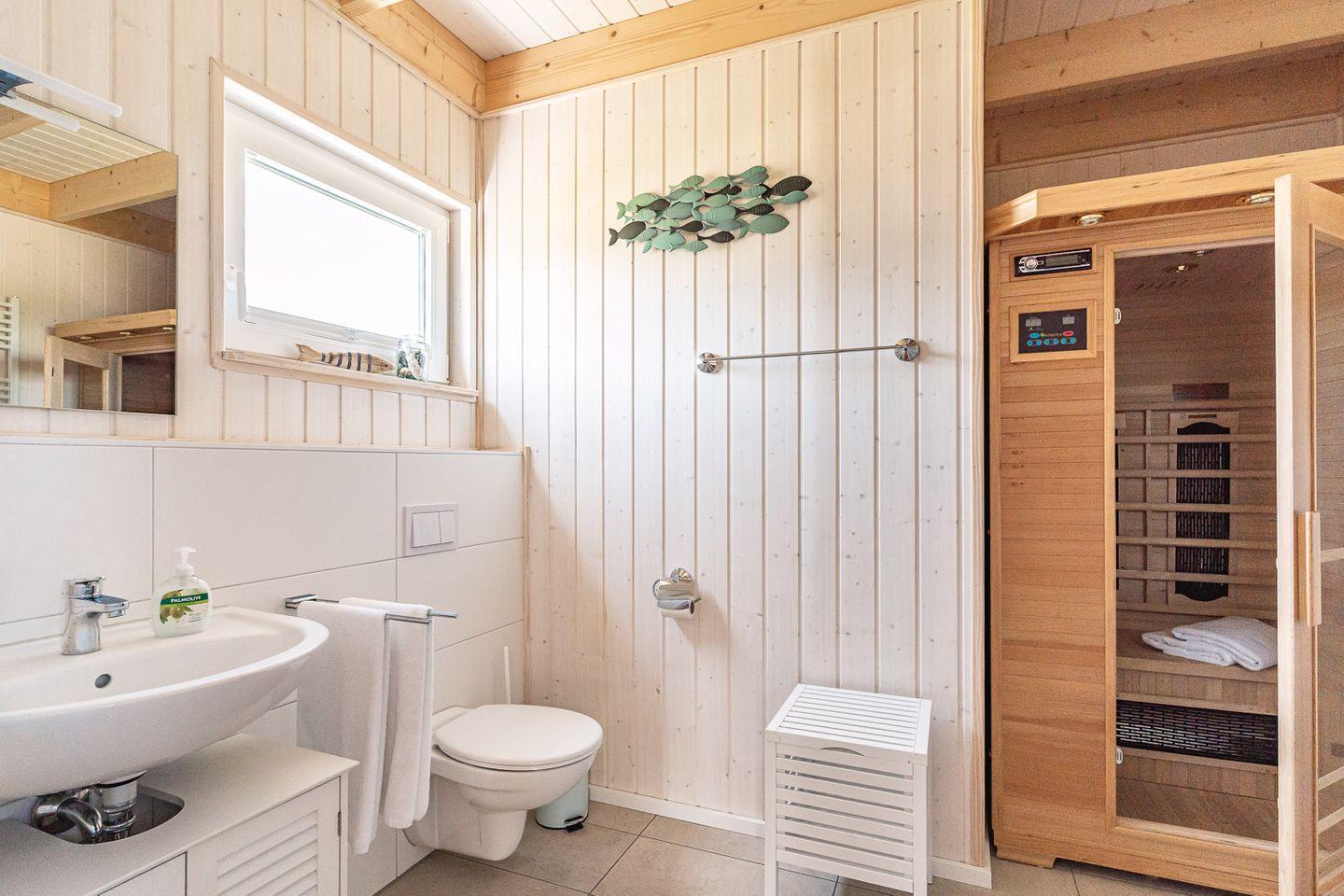 Ein Badezimmer befindet sich im Erdgeschoss und ist mit einer Dusche und dem Highlight, einer Infrarot-Sauna, ausgestattet. Hier kannst Du Dich an kalten Tagen aufwärmen und entspannen.