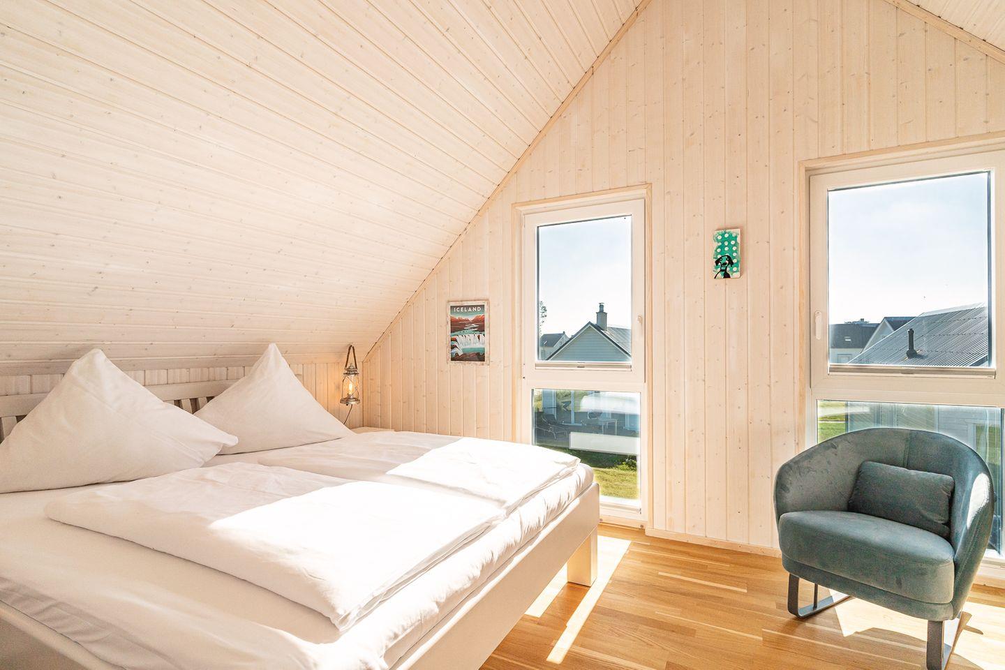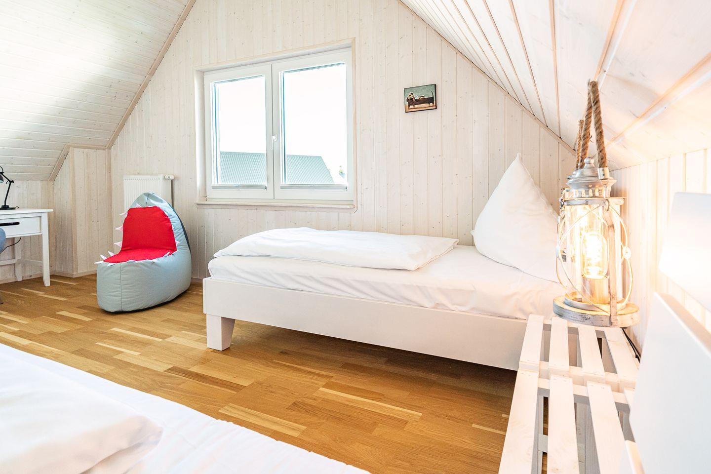 Im ersten Obergeschoss befinden sich die zwei Schlafzimmer. Das eine ist mit einem King-Size-Doppelbett (200x200 cm) und einem Flachbild-TV ausgestattet, das andere verfügt über zwei Einzelbetten (je 90x200 cm). Für erholsame Nächte sind beide Schlafzimmer mit Verdunkelungsmöglichkeiten ausgestattet.