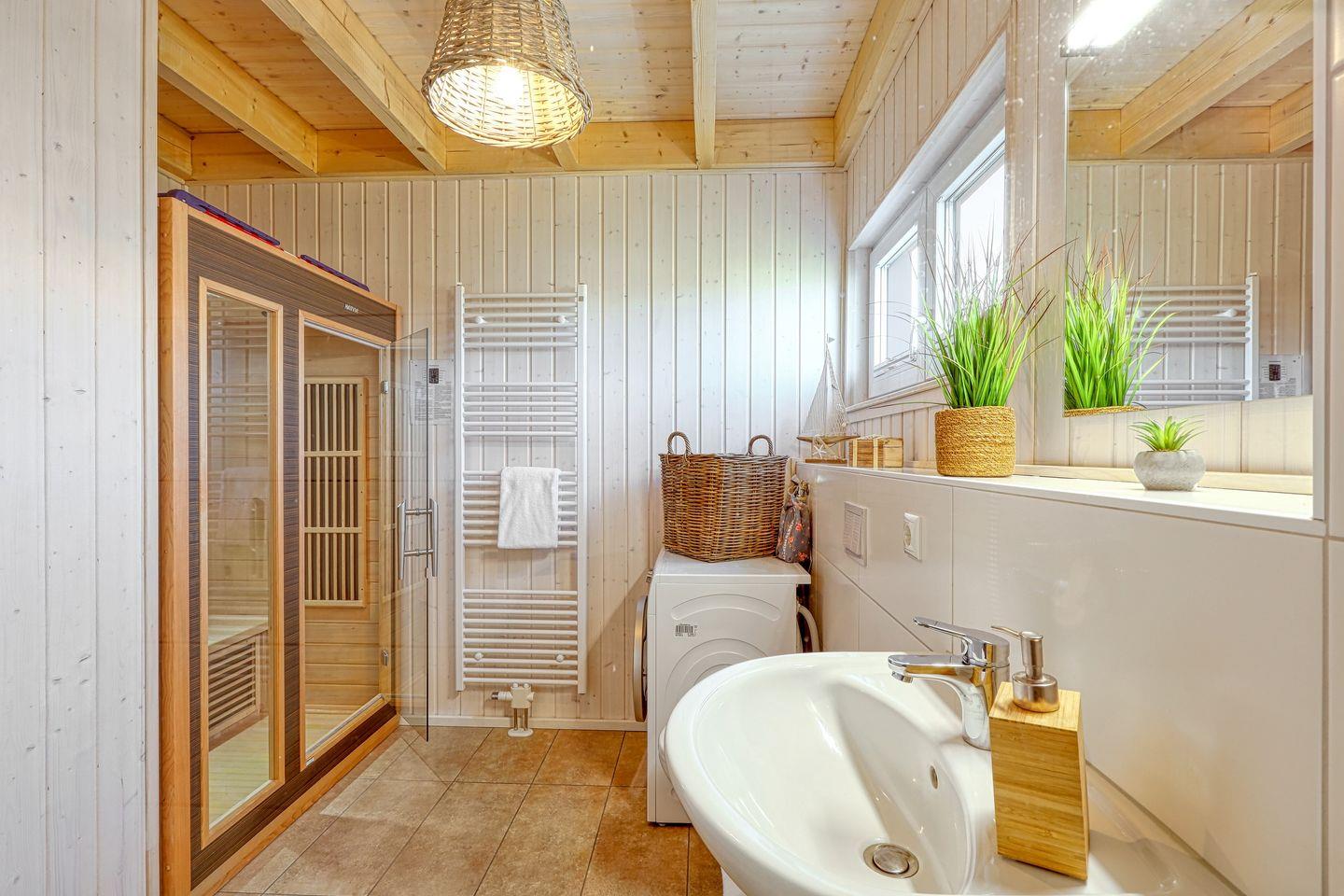Für die kleinen Gäste stehen ein Kinderreisebett und ein Kinderhochstuhl bereit. Ein großzügiges Badezimmer mit Fenster mit Sichtschutz, Dusche, WC und Handtuchheizkörper sowie eine Waschmaschine stehen ebenfalls zur Verfügung. Das Highlight dieses Bades ist die Infrarotkabine, in der Du Dich nach ausgiebigen Strandspaziergängen aufwärmen und entspannen kannst.