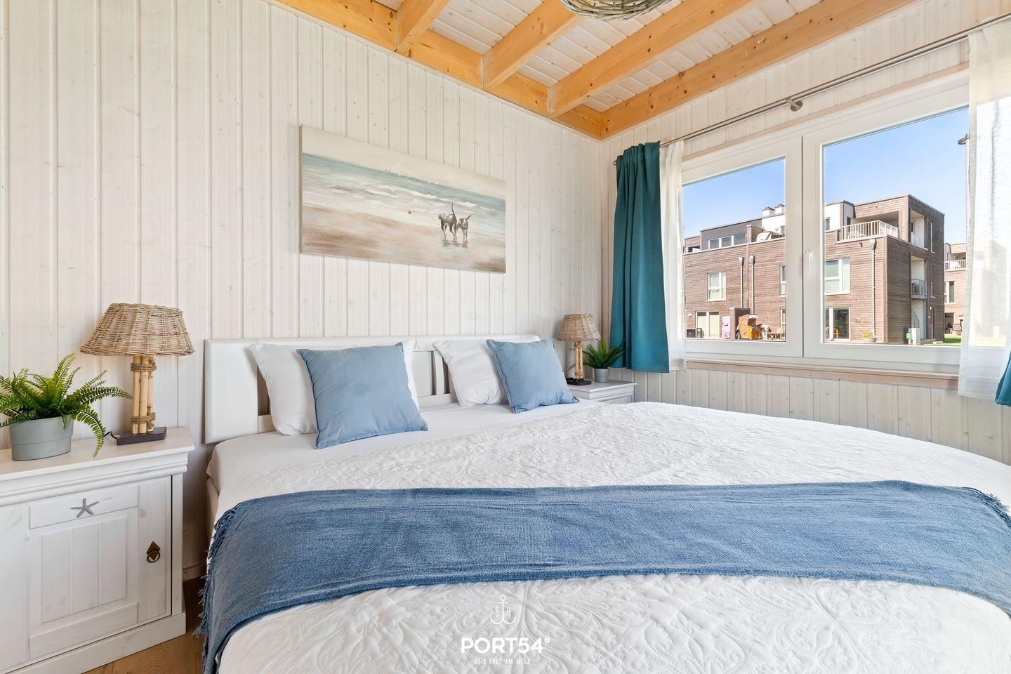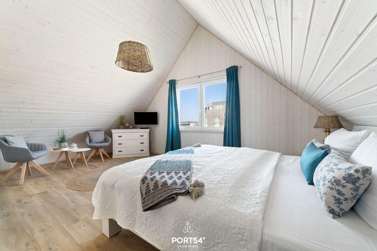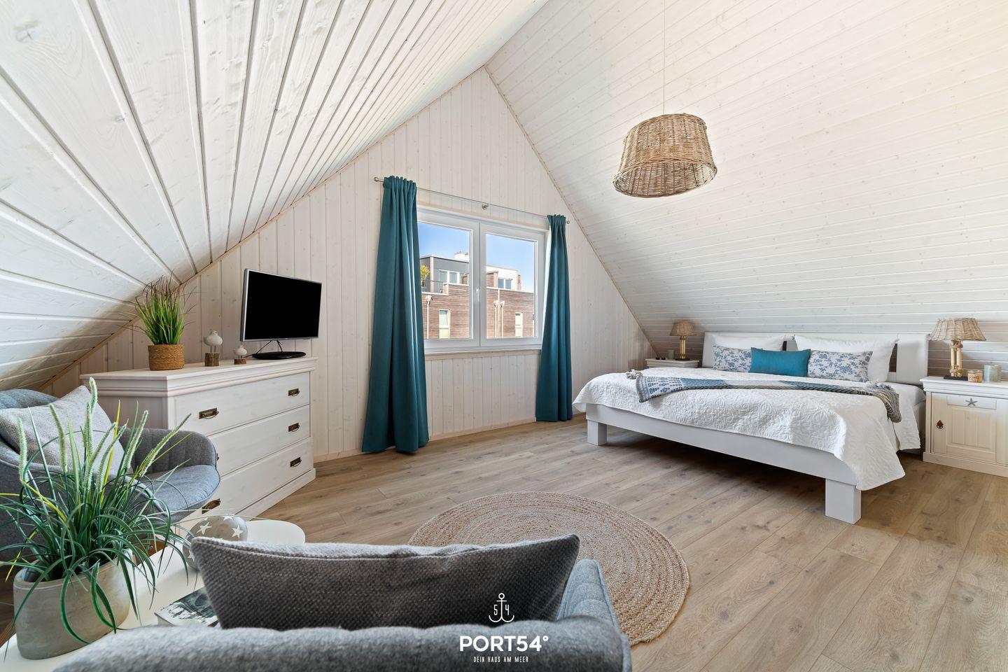 Das Obergeschoss beherbergt ein weiteres, komfortables Schlafzimmer mit Doppelbett (180x200 cm), Schrank, Kommode und Flachbild-TV. Zusätzlich befindet sich hier ein Schlafsofa (140x200 cm), das Platz für ein Kind bietet. Auch hier stehen Verdunkelungsmöglichkeiten und Insektenschutz zur Verfügung.