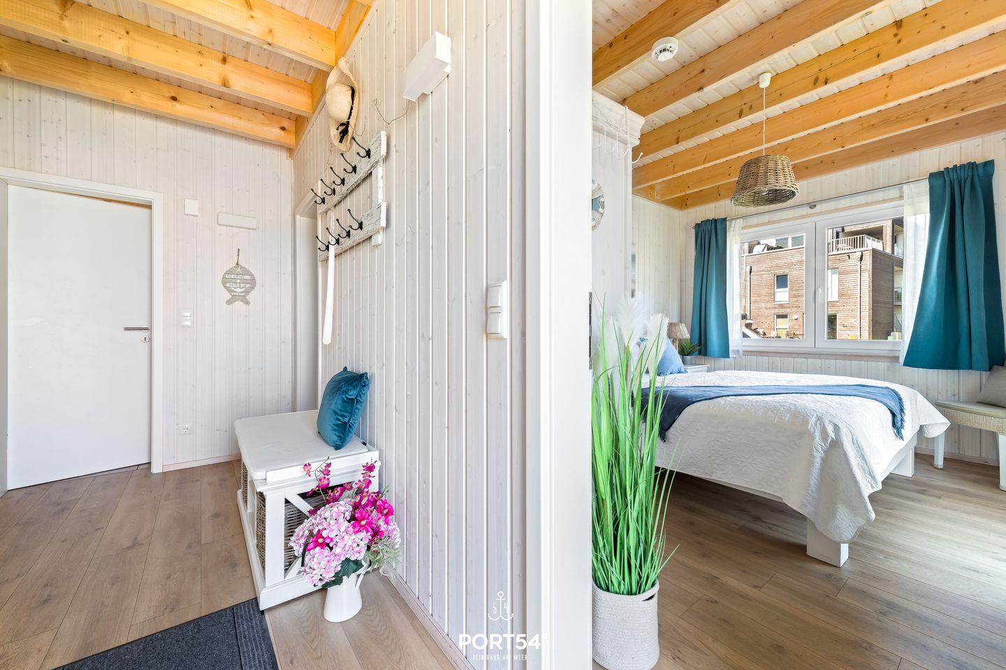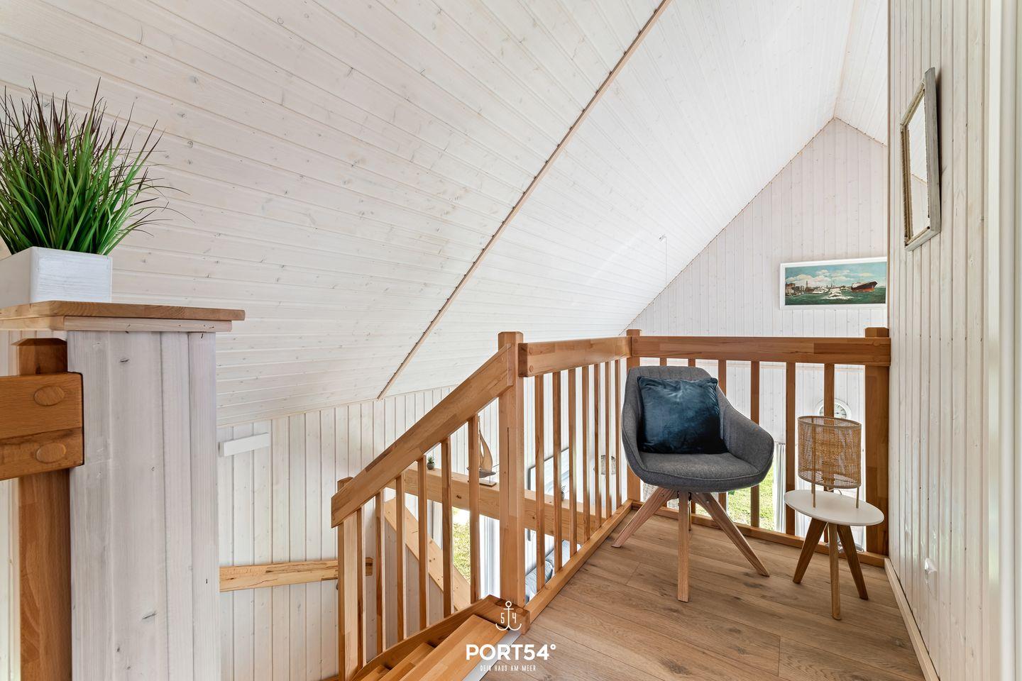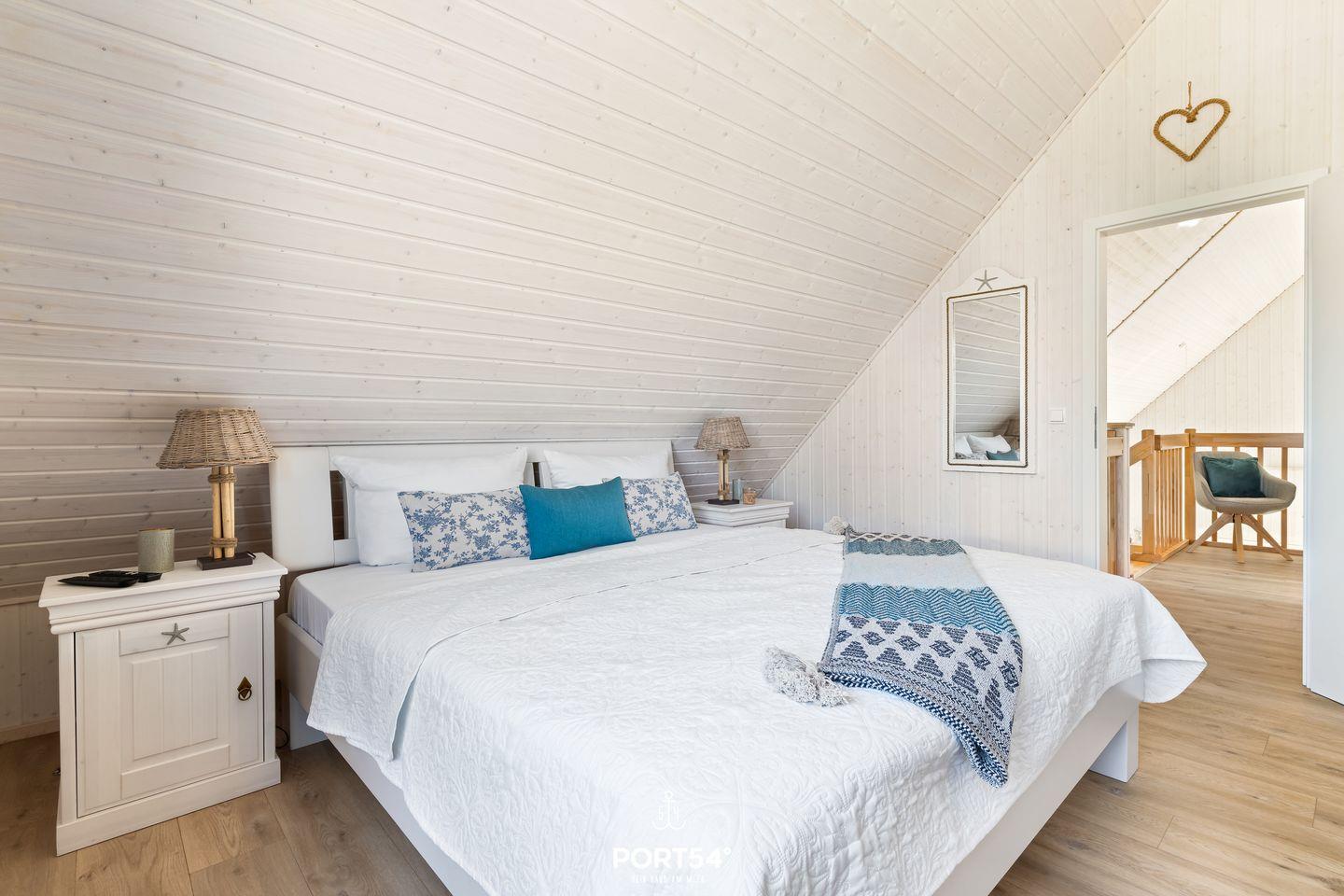 Das Obergeschoss beherbergt ein weiteres, komfortables Schlafzimmer mit Doppelbett (180x200 cm), Schrank, Kommode und Flachbild-TV. Zusätzlich befindet sich hier ein Schlafsofa (140x200 cm), das Platz für ein Kind bietet. Auch hier stehen Verdunkelungsmöglichkeiten und Insektenschutz zur Verfügung.
