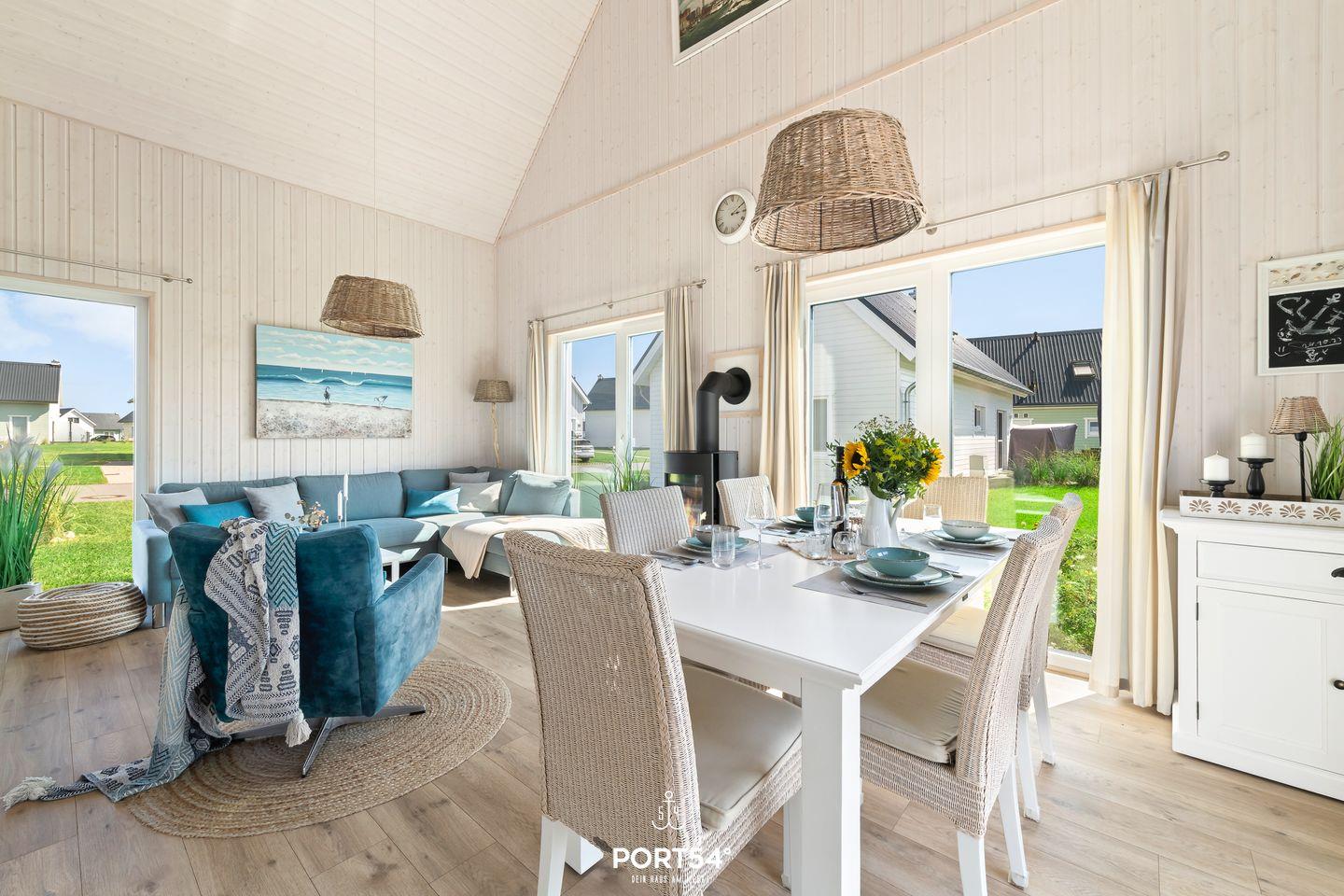 Das Haus befindet sich in unmittelbarer Nähe vom idyllischen Weidefelder Strand – der ideale Ort für lange Spaziergänge und erfrischende Bäder. Der loftartige Wohnbereich besticht durch seine großen Fenster, die den Raum mit Licht durchfluten, und schafft ein großzügiges, einladendes Wohngefühl.