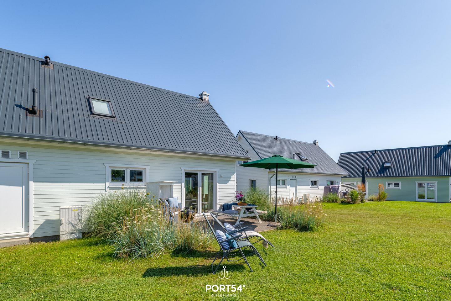 Genieße die Sonne auf der großen Südwest-Terrasse, umgeben von charmantem Pampasgras. Entspanne Dich auf den stilvollen Holzmöbeln oder im gemütlichen Strandkorb. Vier Sonnenliegen laden zum Relaxen ein, während der Grill perfekte Voraussetzungen für unvergessliche Grillabende im Kreise der Familie bietet.