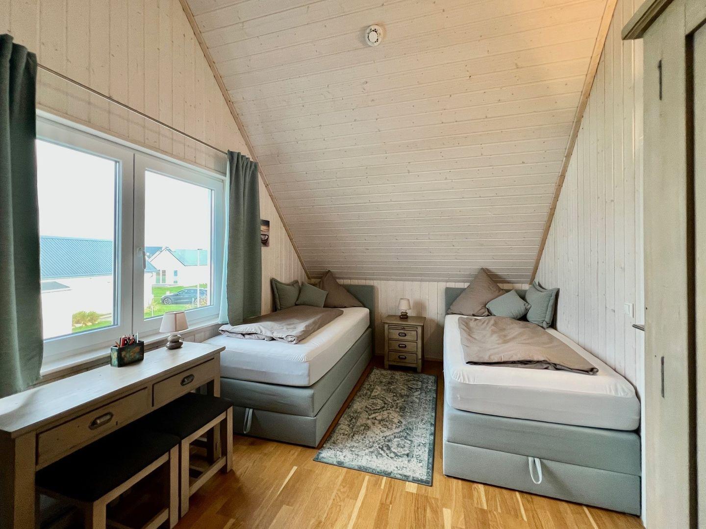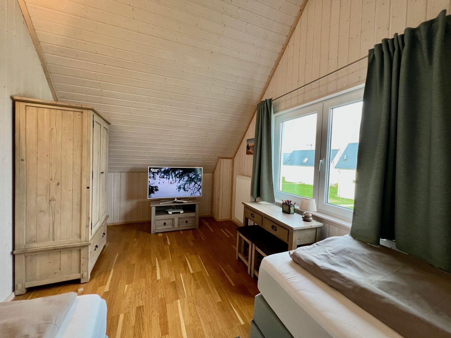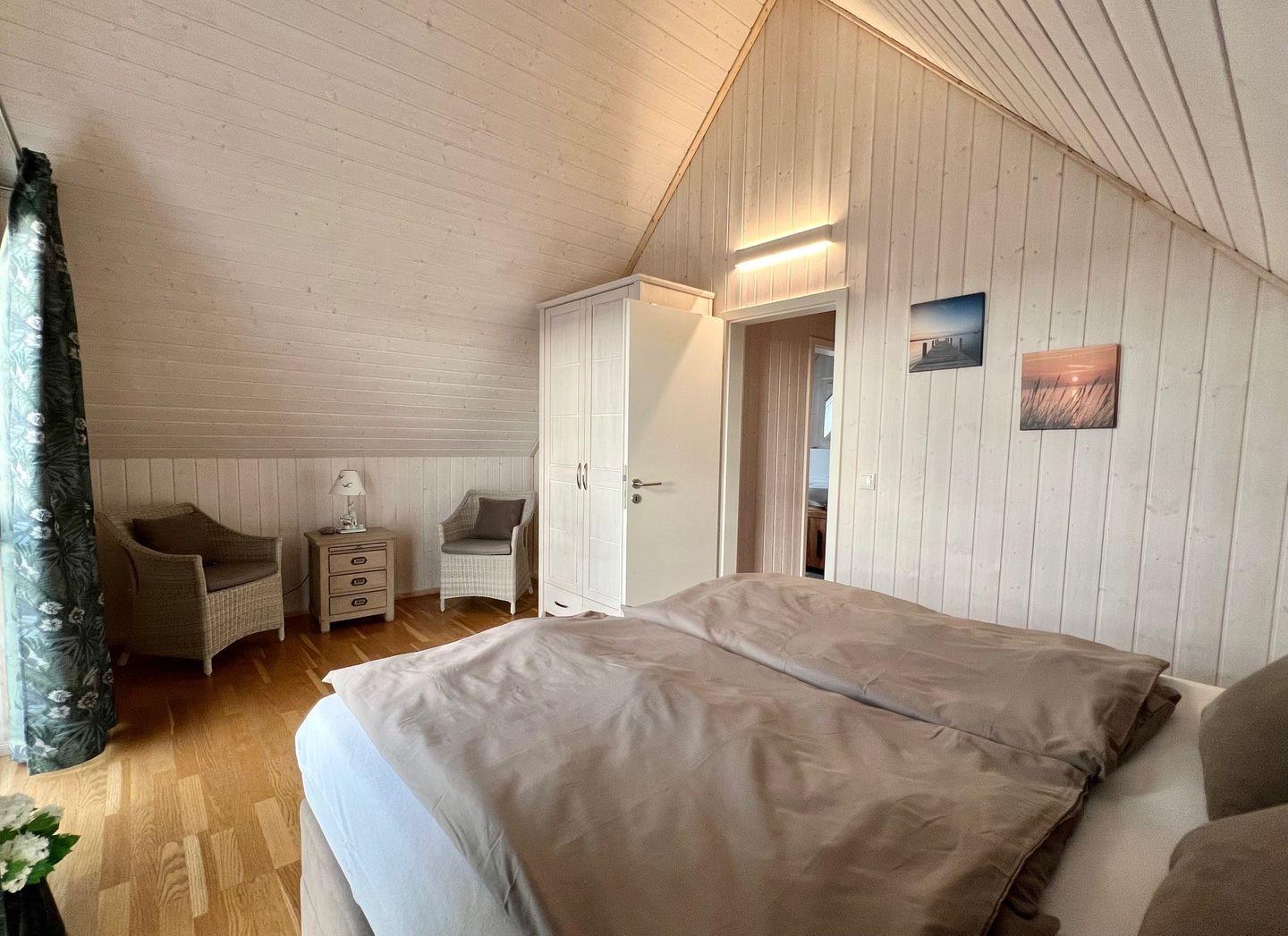Im Obergeschoss befinden sich zwei geschmackvoll eingerichtete Schlafzimmer. Eines der beiden Zimmer bietet ein gemütliches Doppelbett (180x200 cm) und einen Schrank, das zweite Schlafzimmer ist mit zwei Einzelbetten (90x200 cm) sowie ebenfalls mit einem Schrank und einem Flachbild-TV ausgestattet. Beide Zimmer verfügen über Verdunkelungsmöglichkeiten, sodass einem erholsamen Schlaf nichts im Wege steht.