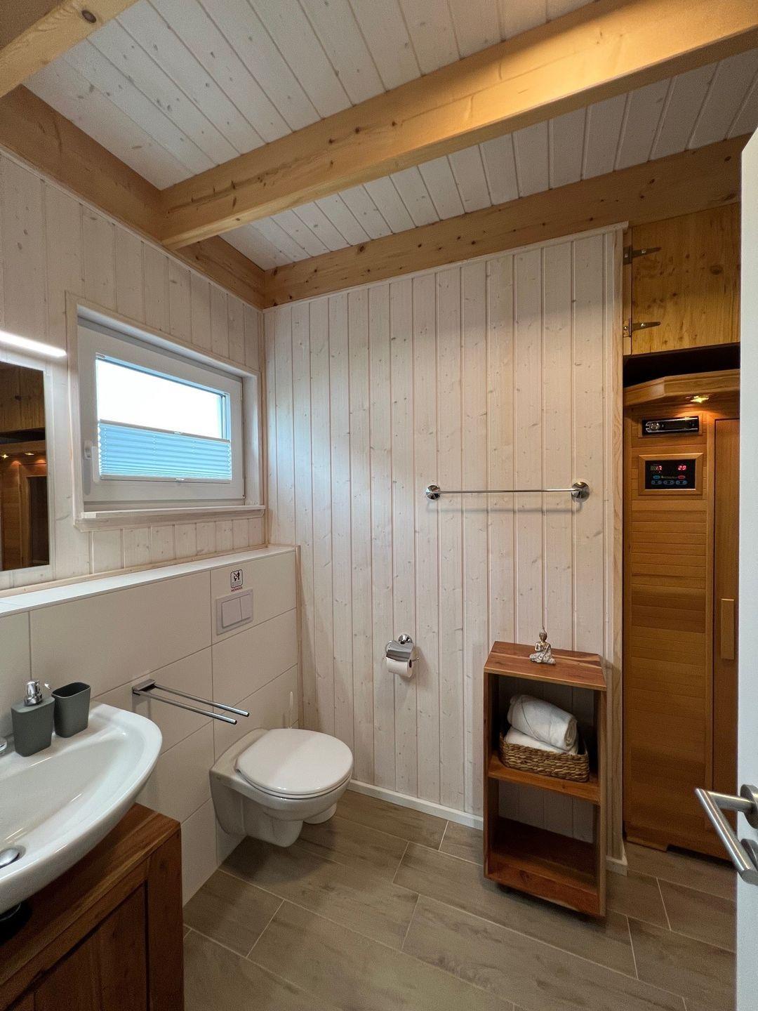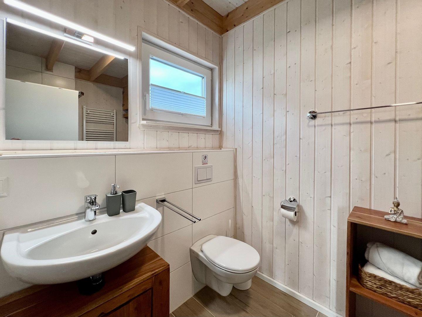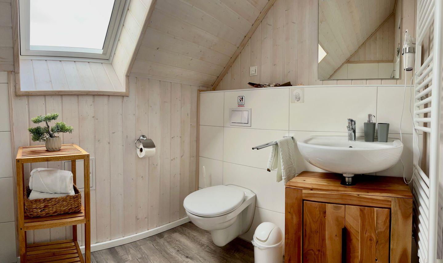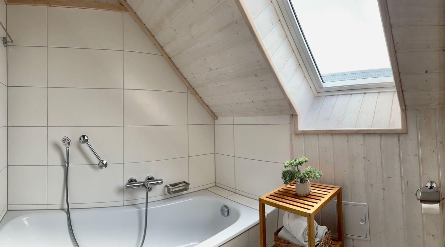 Das Bad im Obergeschoss bietet ein Dachfenster mit Sichtschutz, eine Badewanne, eine Handtuchheizung, einen Föhn und ein weiteres WC.