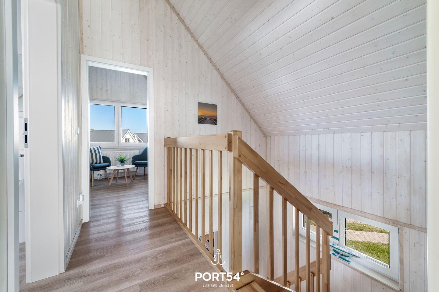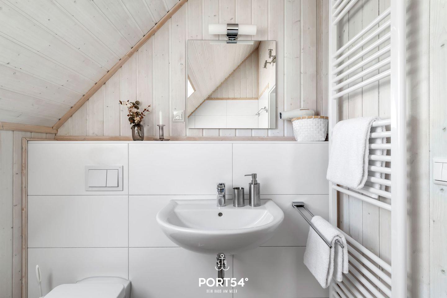 Ein Bad rundet das Erdgeschoss ab. Das Badezimmer verfügt über ein Fenster mit Sichtschutz, eine Dusche, eine Handtuchheizung und über ein besonderes Highlight: eine Infrarotkabine. Hier kannst Du Dich nach langen Strandspaziergängen aufwärmen und entspannen.