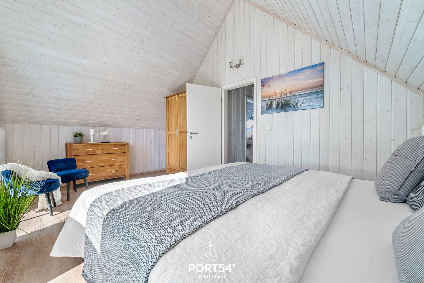 Im Obergeschoss befinden sich zwei Schlafzimmer. Eines der beiden Zimmer bietet ein gemütliches Doppelbett (180 cm x 200 cm) und einen Schrank, das zweite Schlafzimmer ist mit zwei Einzelbetten (90 cm x 200 cm) sowie ebenfalls mit einem Schrank ausgestattet. Beide Zimmer verfügen über Verdunkelungsmöglichkeiten und Insektenschutz, sodass einem erholsamen Schlaf nichts im Wege steht.