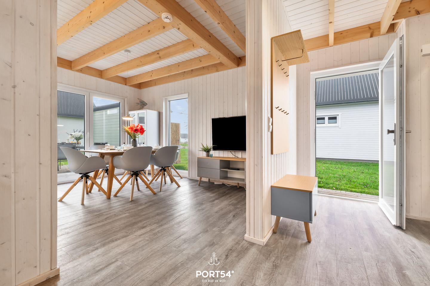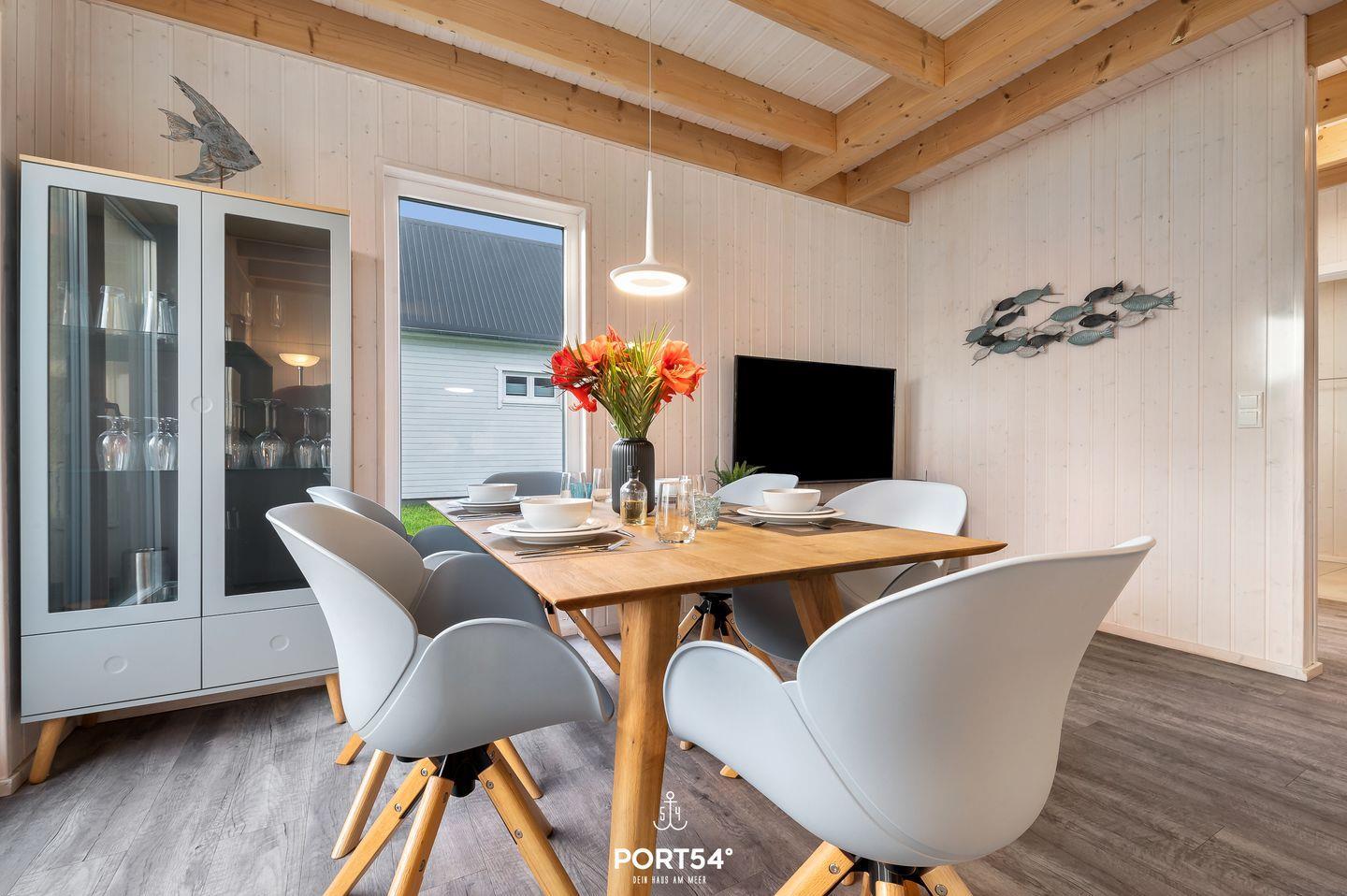 Die großen Fenster sorgen für ein lichtdurchflutetes, großzügiges Wohngefühl. Im Wohnbereich kannst Du es Dir auf dem Sofa gemütlich machen, ein gutes Buch lesen oder auf dem Flachbild-TV Deine Lieblingsserie schauen. Das Sofa lässt sich mit wenigen Handgriffen zu einem Schlafsofa umfunktionieren, sodass ein weiterer Schlafplatz für ein Kind zur Verfügung steht. An kühlen Abenden verbreitet der Kamin eine wohlige Wärme.