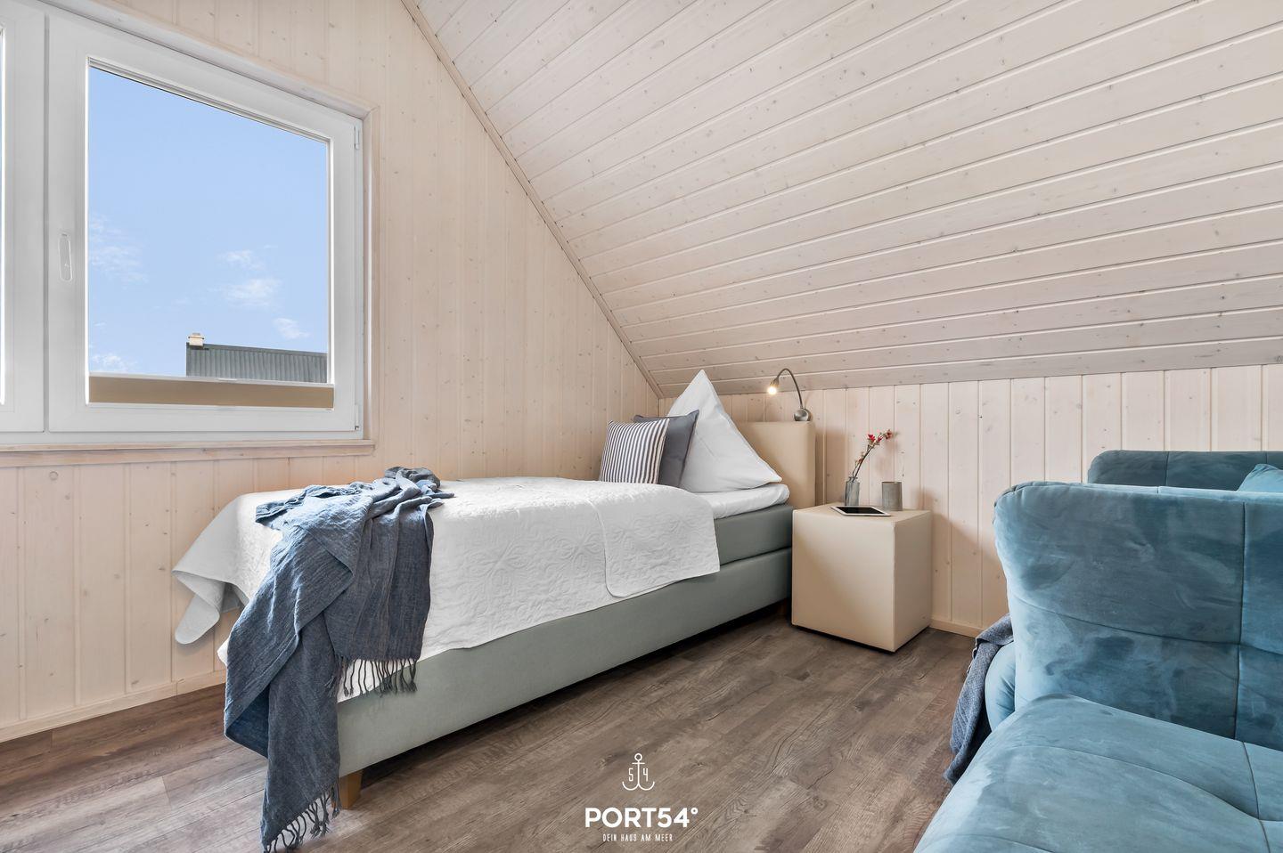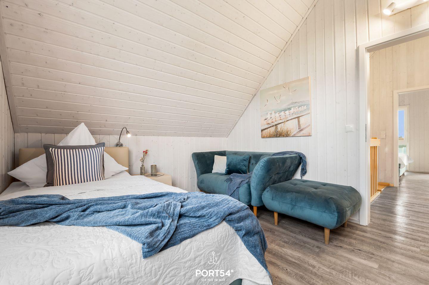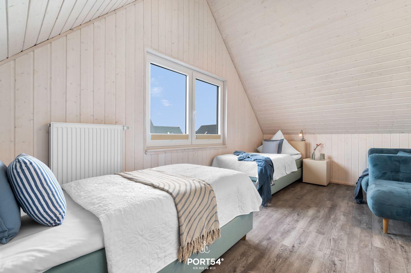 Im Obergeschoss befinden sich zwei Schlafzimmer. Eines der beiden Zimmer bietet ein gemütliches Boxspringbett (180x200 cm) und einen Schrank, das zweite Schlafzimmer ist mit zwei Boxspringbetten (je 90x200 cm) sowie ebenfalls mit einem Schrank ausgestattet. Beide Zimmer verfügen über Insektenschutz und Verdunkelungsmöglichkeiten, sodass einem erholsamen Schlaf nichts im Wege steht.
