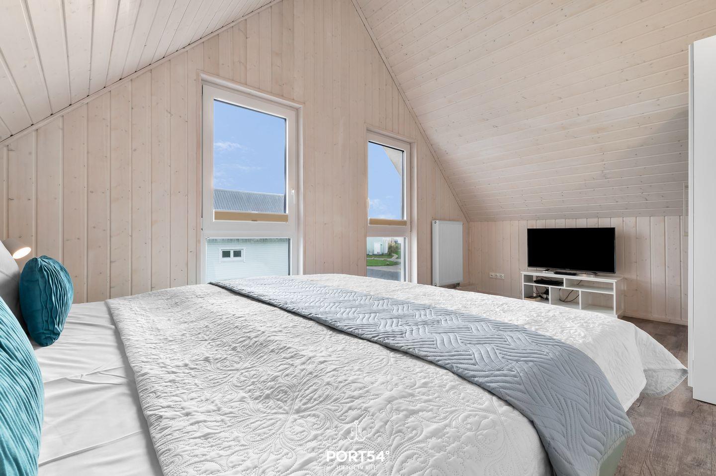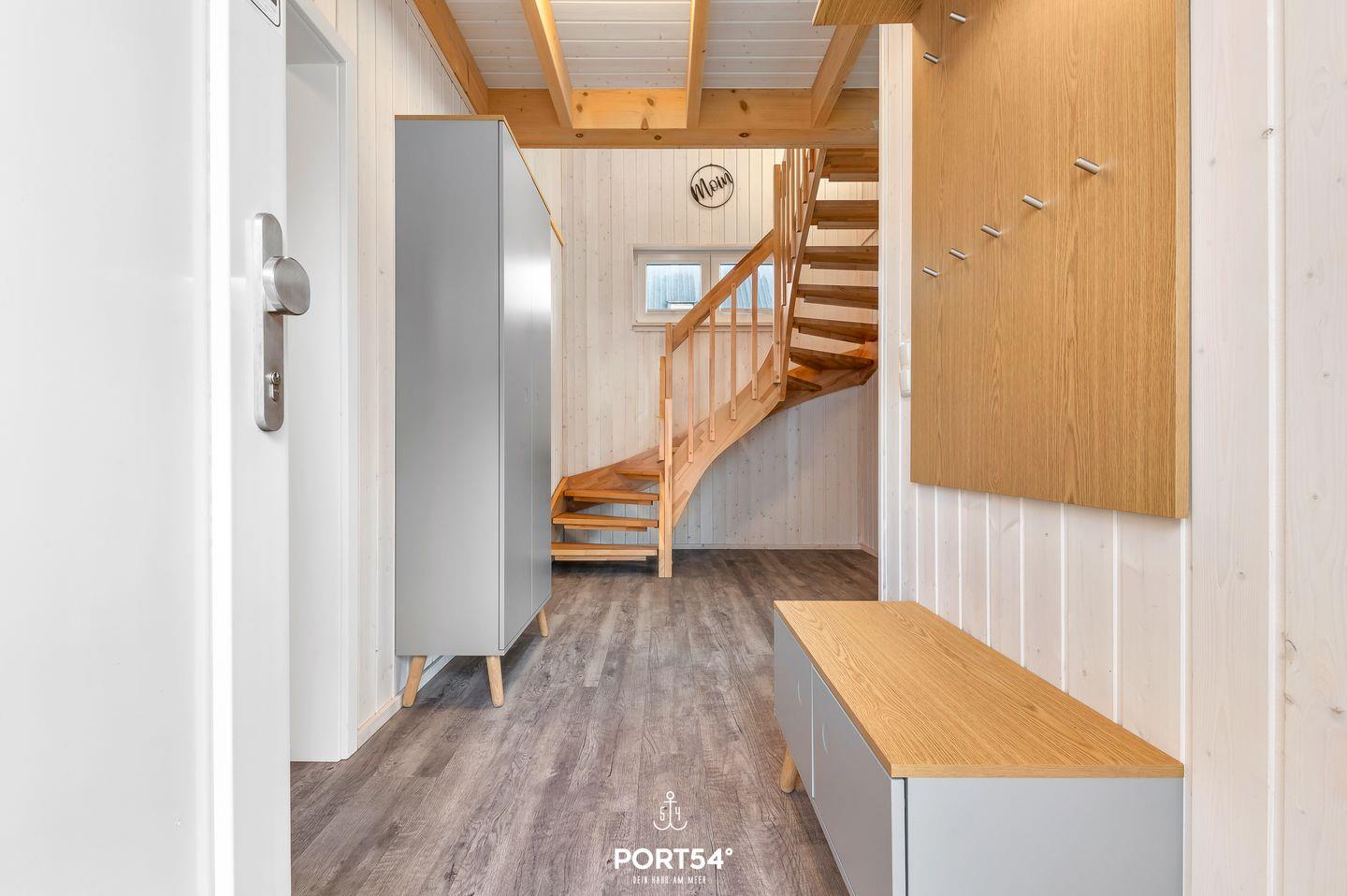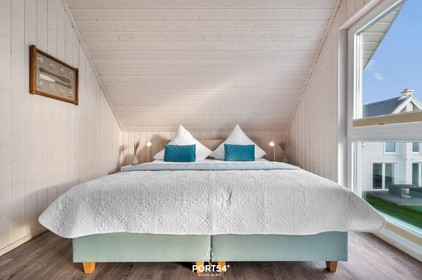 Im Obergeschoss befinden sich zwei Schlafzimmer. Eines der beiden Zimmer bietet ein gemütliches Boxspringbett (180x200 cm) und einen Schrank, das zweite Schlafzimmer ist mit zwei Boxspringbetten (je 90x200 cm) sowie ebenfalls mit einem Schrank ausgestattet. Beide Zimmer verfügen über Insektenschutz und Verdunkelungsmöglichkeiten, sodass einem erholsamen Schlaf nichts im Wege steht.