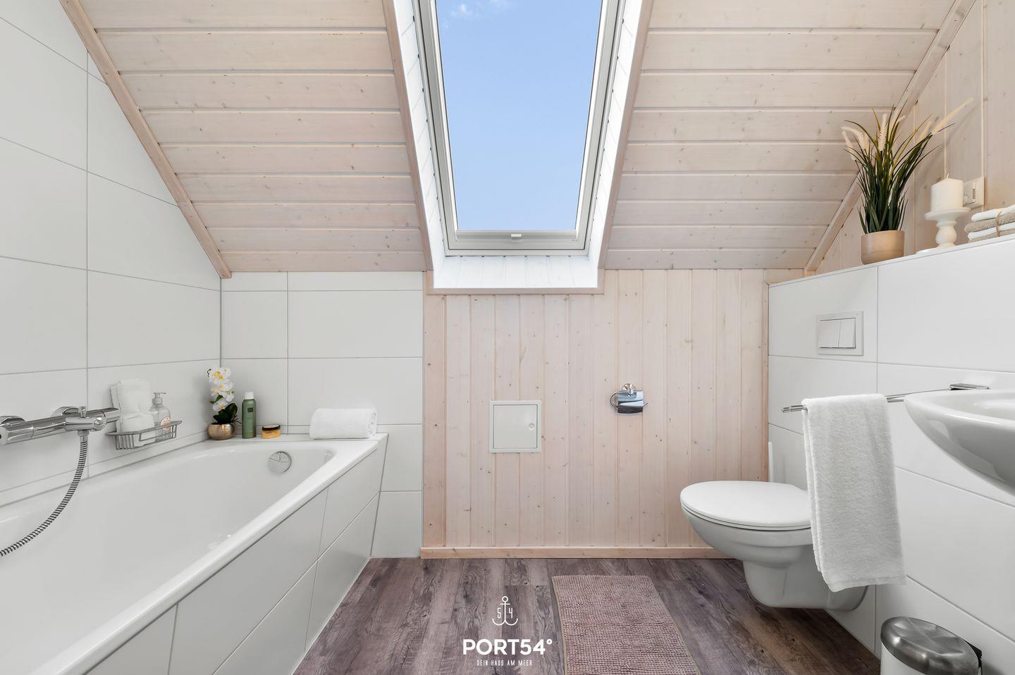 Das Bad im Obergeschoss bietet ein Dachfenster mit Sichtschutz, eine Badewanne, eine Handtuchheizung, einen Föhn und ein weiteres WC.