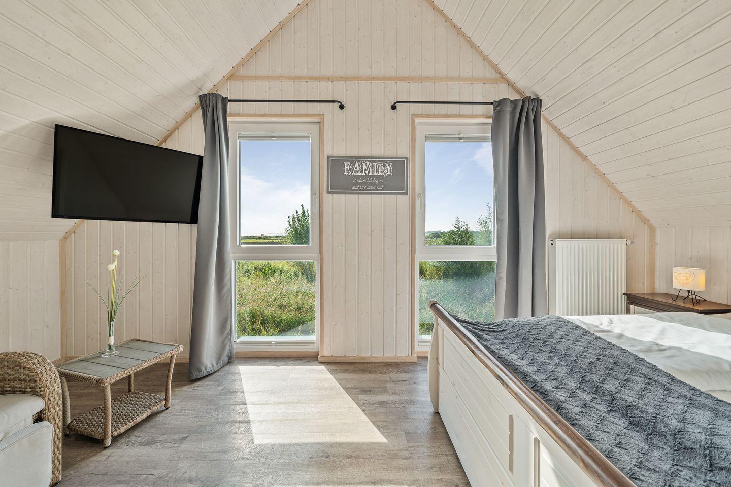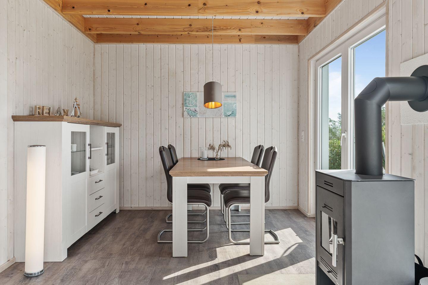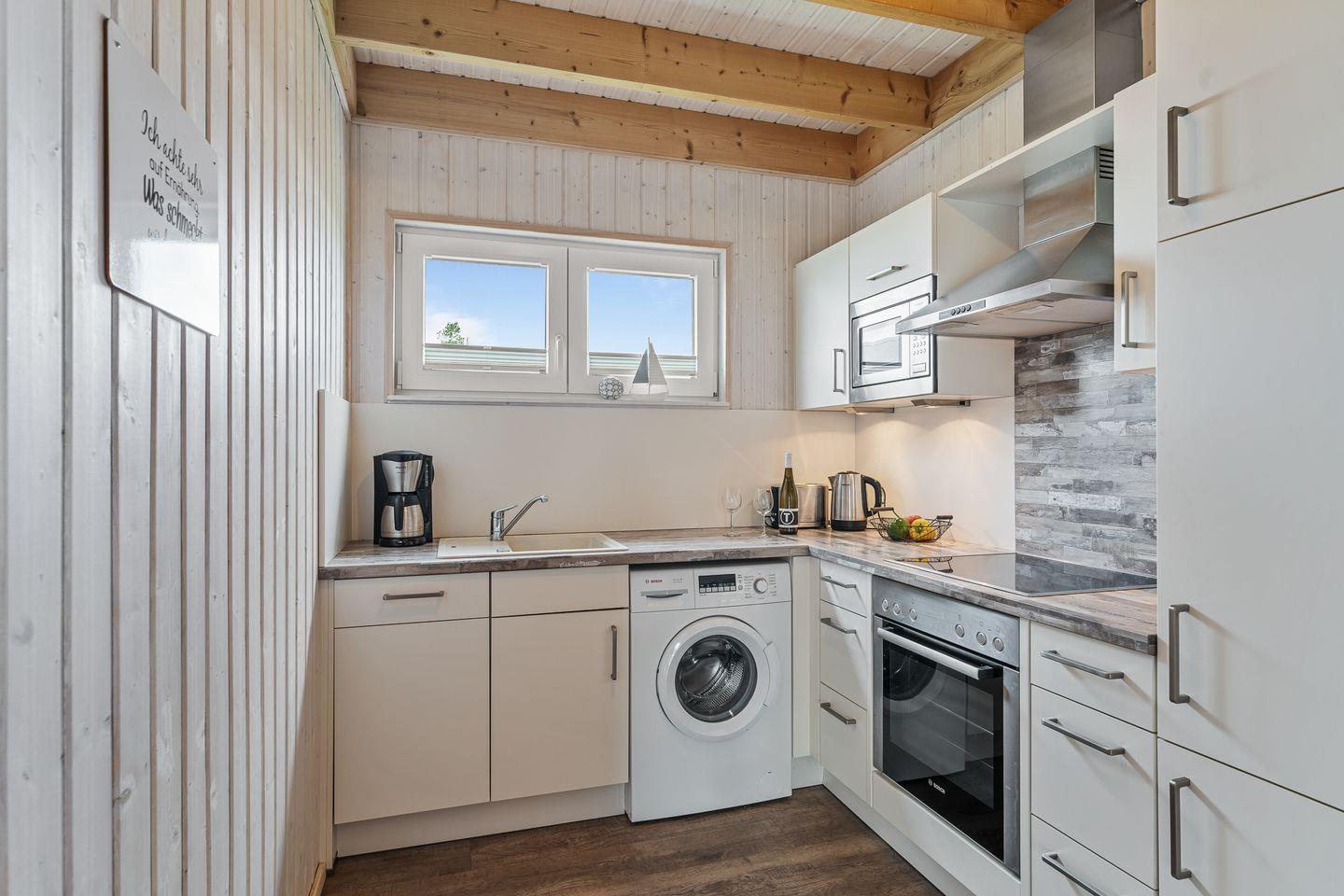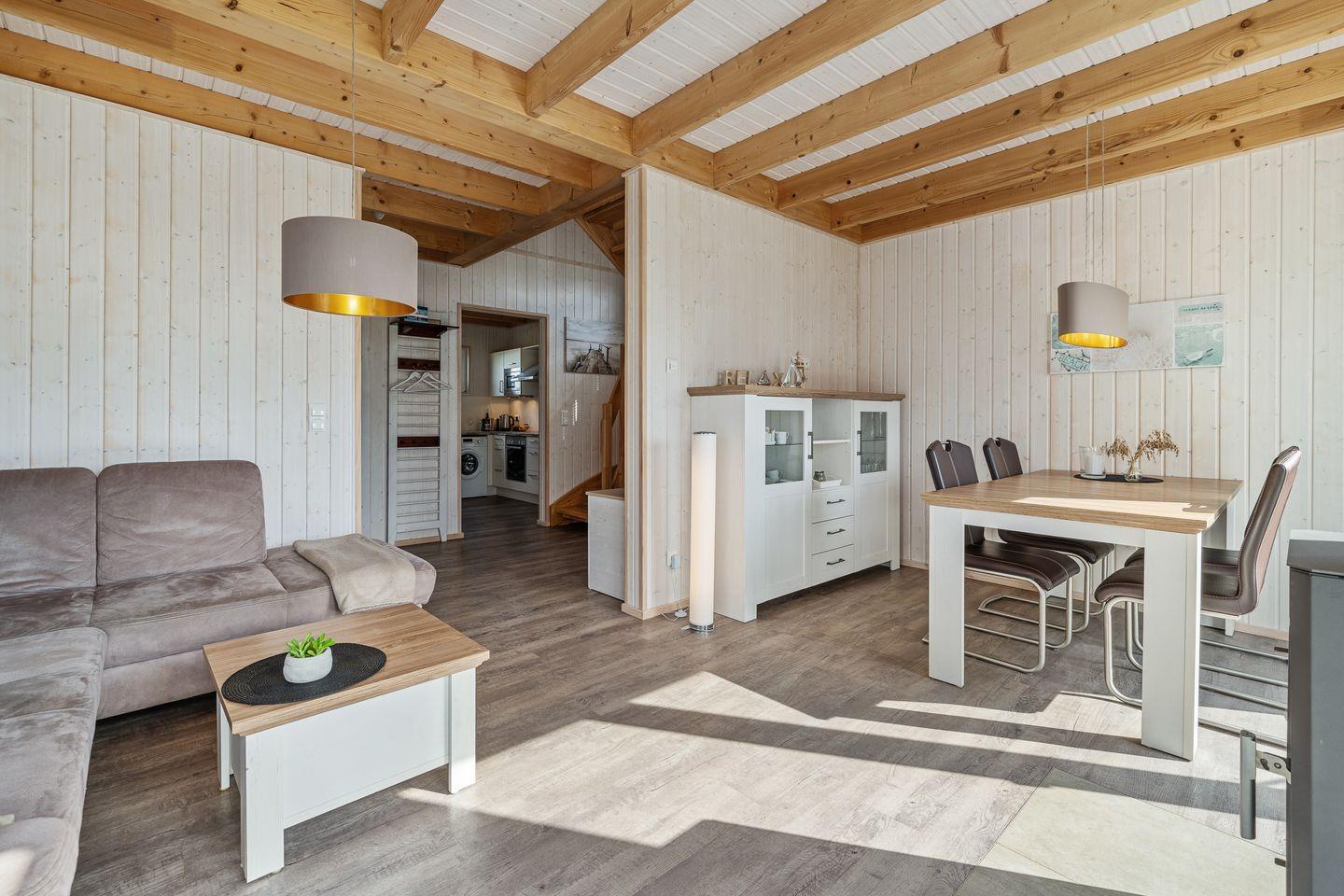 Das Haus verfügt über einen offenen Wohn- und Essbereich mit Kaminofen, eine Küchenzeile, zwei Schlafzimmer und zwei Bäder. Die Küche ist voll ausgestattet. Auf der möblierten Terrasse können Sie gemütliche Grillabende verbringen. Zwei Schlafzimmer verfügen über je ein Doppelbett und 2 Einzelbetten, zwei weitere Schlafplätze für Kinder bietet ein Schlafsofa (120x200cm). Ein Bad ist mit einer Dusche ausgestattet, das zweite mit einer Badewanne. Direkt vor dem Haus gibt es 2 PKW-Stellplätze.
