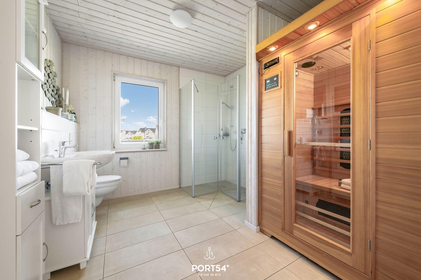 Das Bad bietet eine große ebenerdige Dusche, ein WC, ein Waschbecken und als Highlight eine Infrarotkabine. Hier kannst Du Dich nach langen Strandspaziergängen aufwärmen und entspannen.