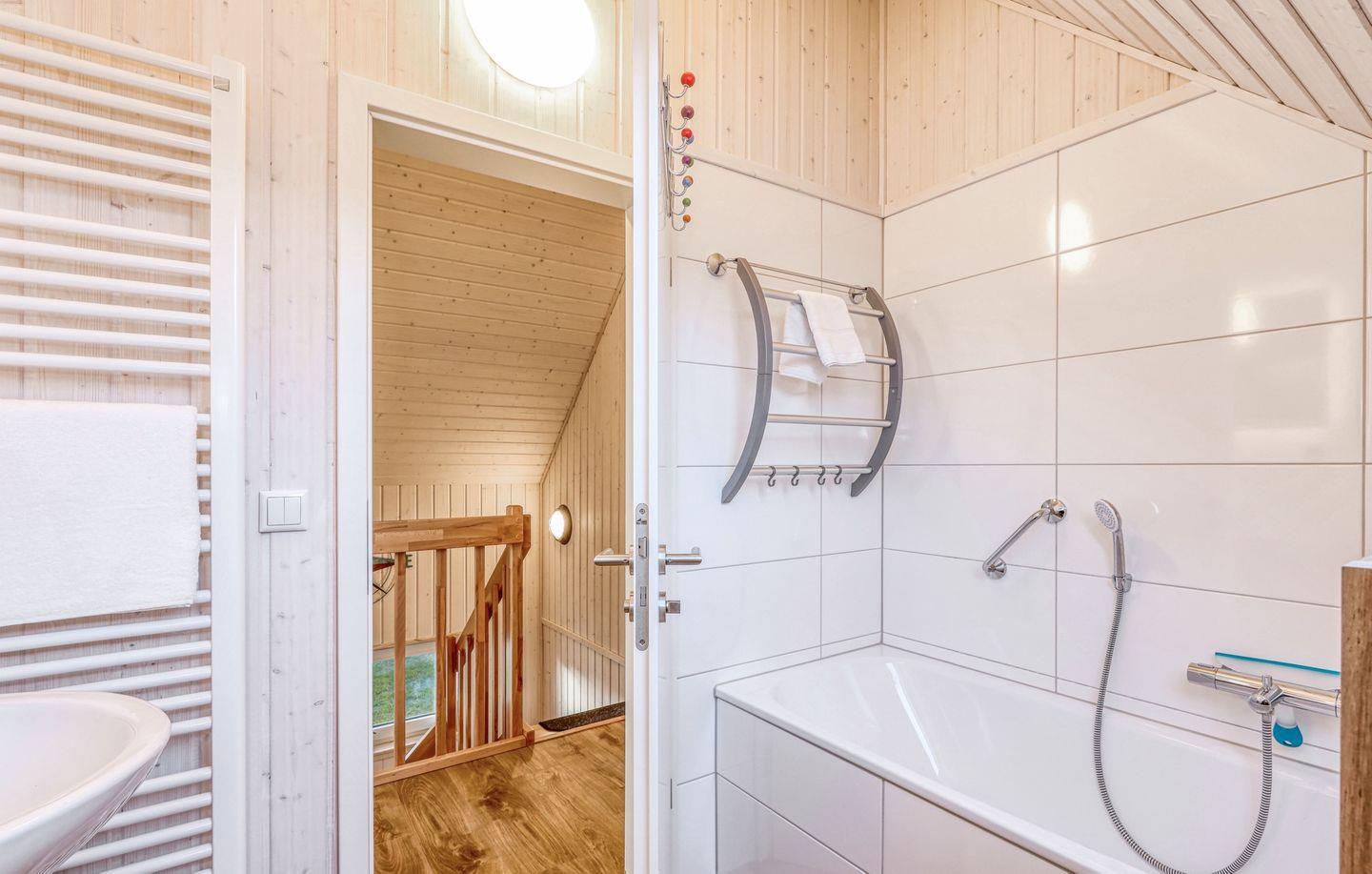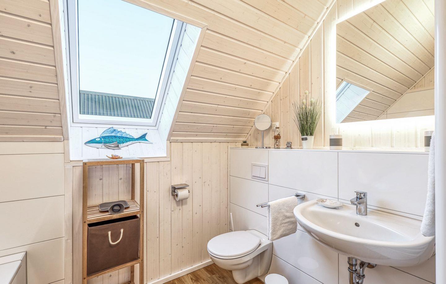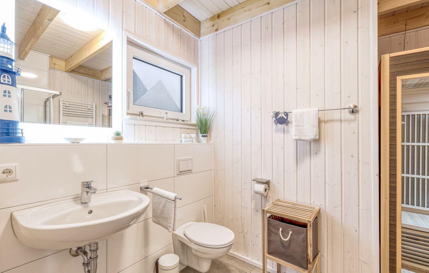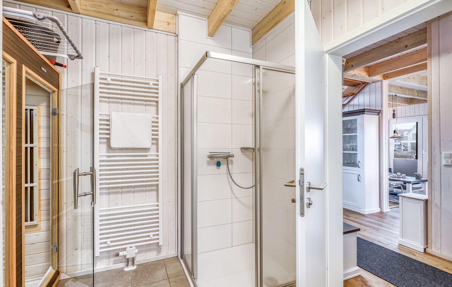 Das großzügige Bad ist ein Highlight: Hier findest Du eine Infrarotkabine, eine ebenerdige Dusche und eine Handtuchheizung, die für zusätzlichen Komfort sorgt.